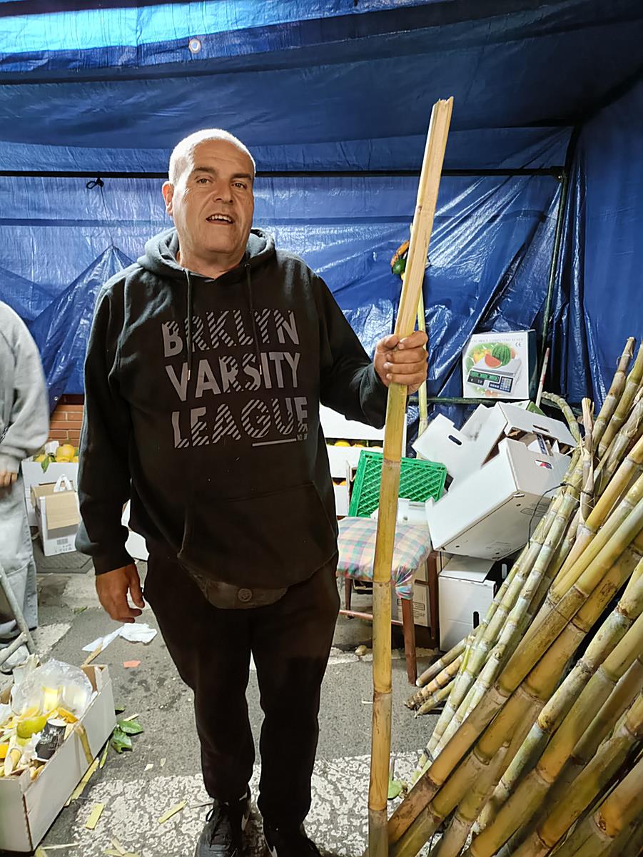 Ángel José Álvarez Pérez mantiene viva la tradición de la venta de la caña en Jinámar, pero lo hace “como favor. Yo no me dedico a esto”, afirma. Es “nacido y criado” en el pueblo, su abuelo y sus tíos maternos se dedicaban a vender este producto y él acompañaba desde que tenía 8 años, ahora cuenta con 53. “Pero yo esto lo hago como afición. Supone mucho trabajo, mucho gasto de agua…” Su cultivo procede de la propia localidad, lo produce en una zona próxima al CC Las Terrazas, el cual riega con agua que le llega directamente de la cumbre. “¿Pero tú sabes cuánta agua se puede llevar una caña que te termina alcanzando hasta 4 metros?”