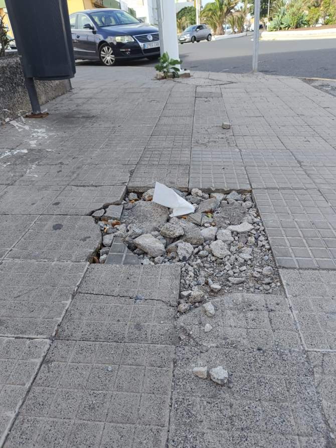 a acera situada en la calle Fernando Sagaseta n.º 24, en el Valle de Jinámar, permanece rota desde hace más de dos meses sin que se haya acometido reparación alguna, según denuncia el dirigente vecinal Juan Medina. Pese a los avisos y fotografías remitidas al servicio de averías de Aguas de Telde, aseguran que “no han hecho nada” y que la zona continúa en el mismo estado.
