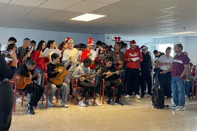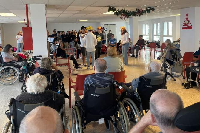 A continuación, el grupo dirigido por el profesor Gaire interpretó Navidad guanche, del grupo Taburiente, seguido de un animado popurrí de villancicos tradicionales. El momento más emotivo llegó con el reparto de postales navideñas realizadas por el alumnado del IES Arencibia Gil, mientras el profesor Gaire y el alumno Yaidán -ambos del IES Lomo de La Herradura- interpretaban la canción Somos costeros, generando un ambiente de especial cercanía en el renovado salón de actos de la residencia.