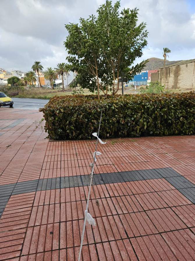 Los vecinos de Jinámar evitaron este domingo la caída de un árbol en el parque situado frente a la oficina de Correos, en el sector de El Cascajo, después de que las fuertes rachas de viento y el exceso de agua acumulada inclinaran el ejemplar, debilitado pero aún con parte de sus raíces funcionales.