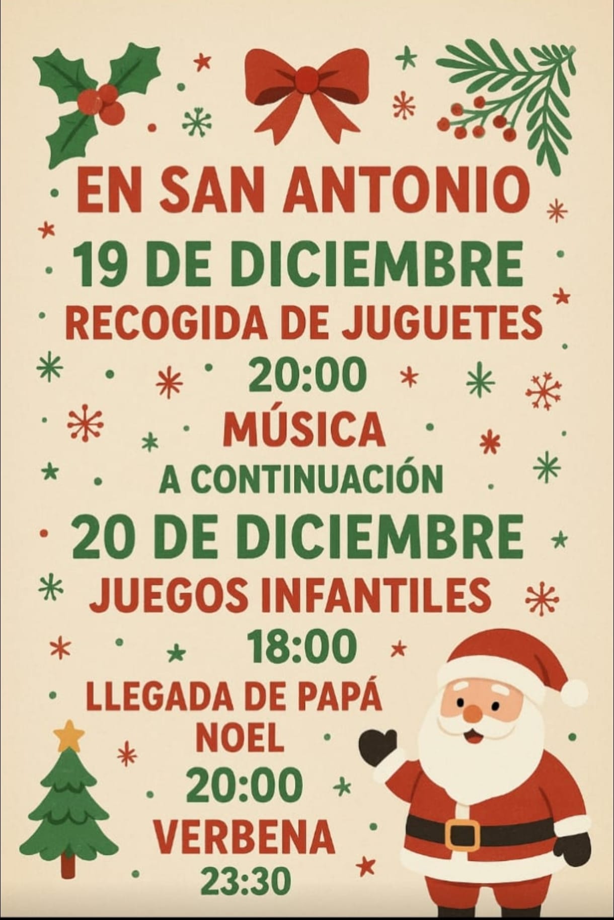 El Patronato de Fiestas de San Antonio ha preparado un fin de semana especial para celebrar la Navidad en el barrio, con un programa festivo que se desarrollará en la plaza pública los días 19 y 20 de diciembre y que combina solidaridad y ocio familiar.