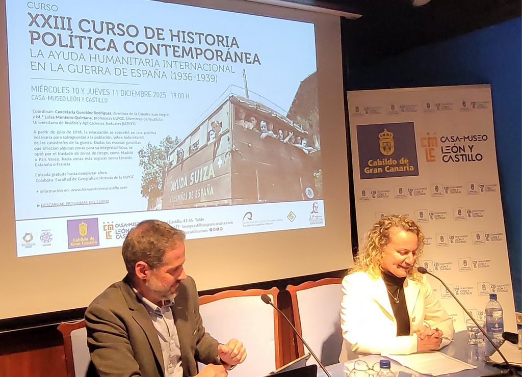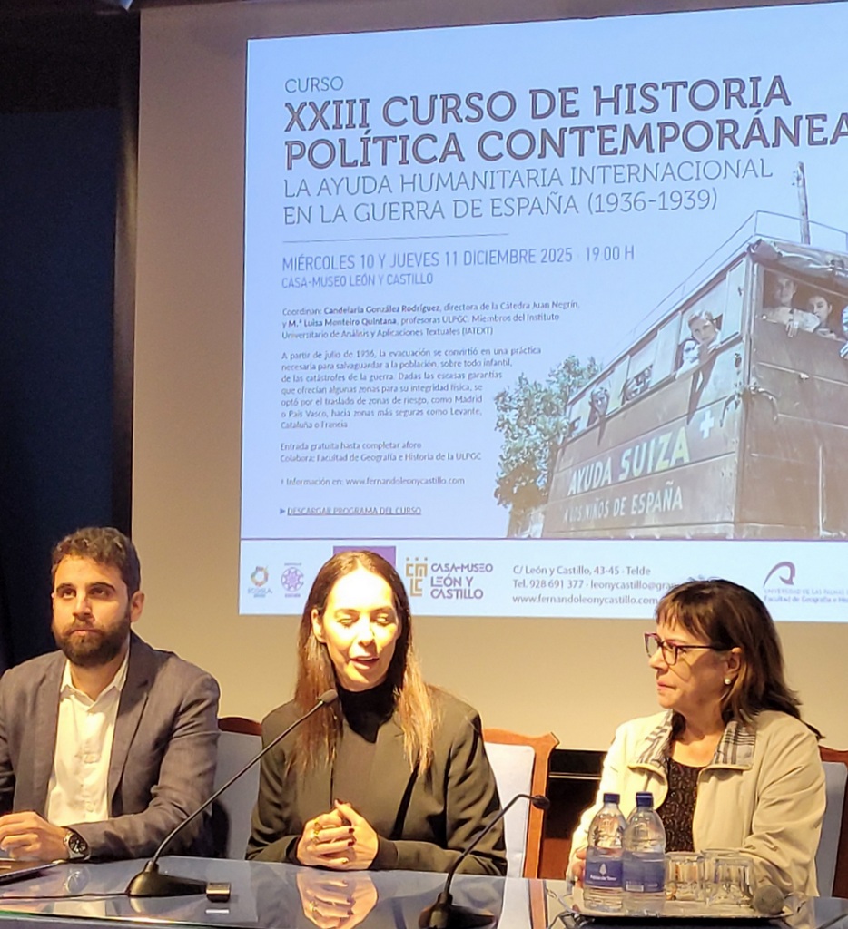 Ponentes en el curso de historia política (Foto: Jesús Ruiz Mesa)La Casa Museo León y Castillo de Telde acogió esta semana el inicio del XXIII Curso de Historia Política Contemporánea centrado en la ayuda humanitaria internacional durante la Guerra Civil Española (1936–1939). El ciclo se abrió con dos ponencias que analizaron la actuación de organizaciones internacionales, redes solidarias y agentes humanitarios durante el conflicto y el posterior exilio republicano, en un contexto marcado por la política de no intervención de los Estados democráticos y la movilización de la sociedad civil internacional.