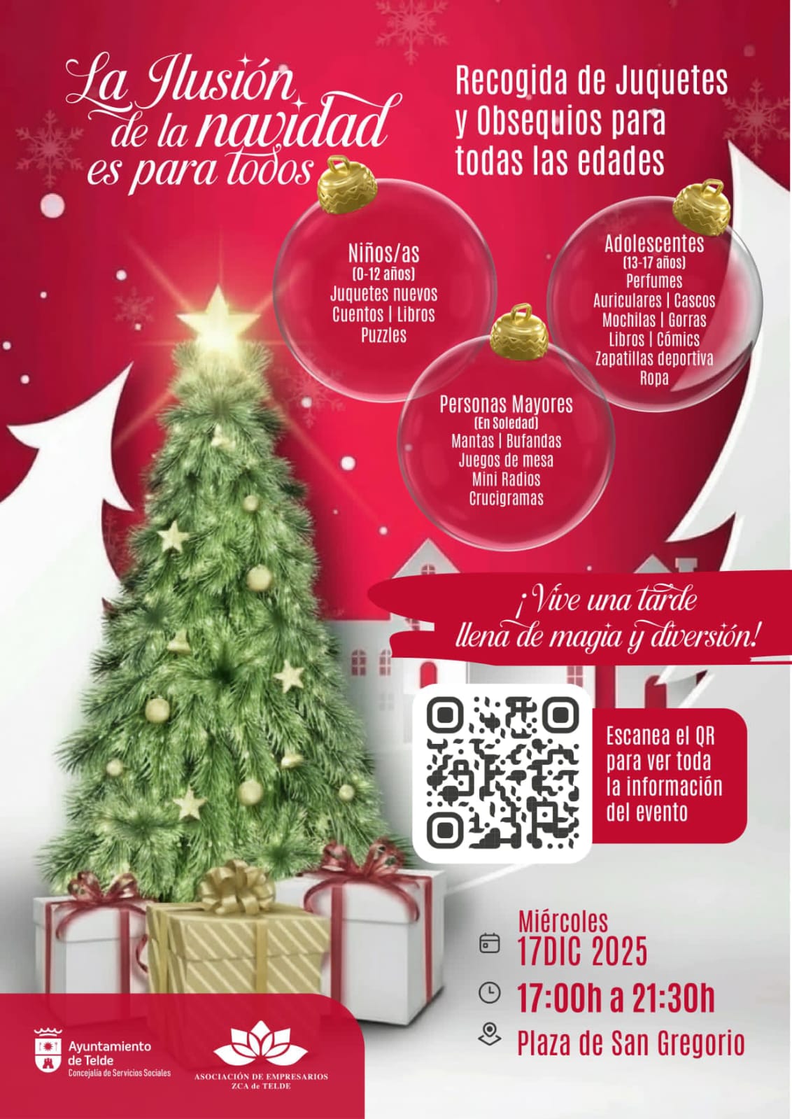 La Navidad es tiempo de ilusión, de encuentros y de gestos que nacen del corazón. Con ese espíritu solidario, el Ayuntamiento de Telde, a través de la Concejalía de Servicios Sociales, impulsa la iniciativa La ilusión de la Navidad es para todos, una jornada especial de recogida de juguetes y obsequios destinada a personas de todas las edades.