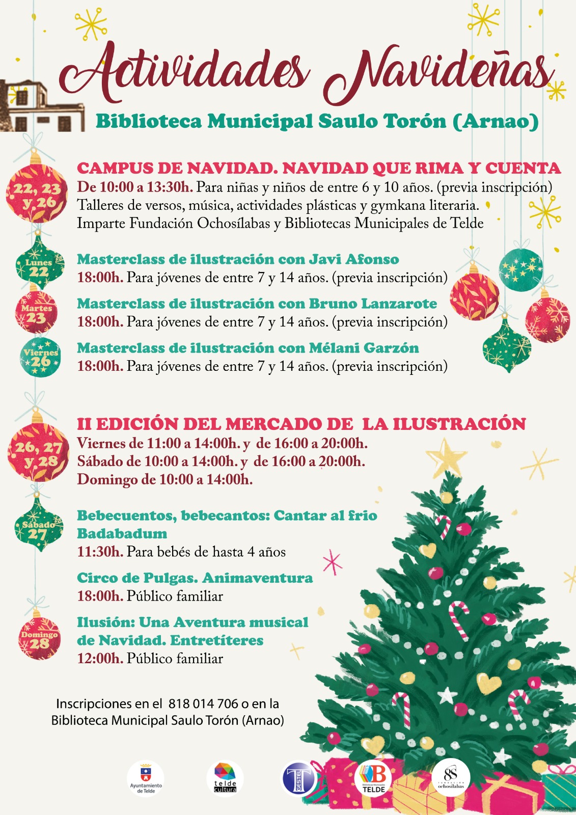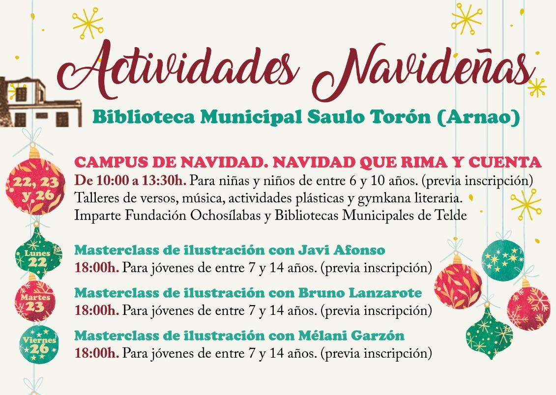Este campus incluirá talleres de versos y música impartidos por la Fundación Ochosílabas, y actividades plásticas y una gymkana literaria a cargo del equipo de Bibliotecas Municipales de Telde. Dentro del campus, se desarrollará además un ciclo de masterclass de ilustración dirigidas a jóvenes de entre 7 y 14 años, también con inscripción previa. El lunes 23 de diciembre, a las 18.00 horas, tendrán lugar las masterclass impartidas por Javi Afonso y Bruno Lanzarote, mientras que el viernes 26 de diciembre, a la misma hora, será el turno de Mélani Garzón.
