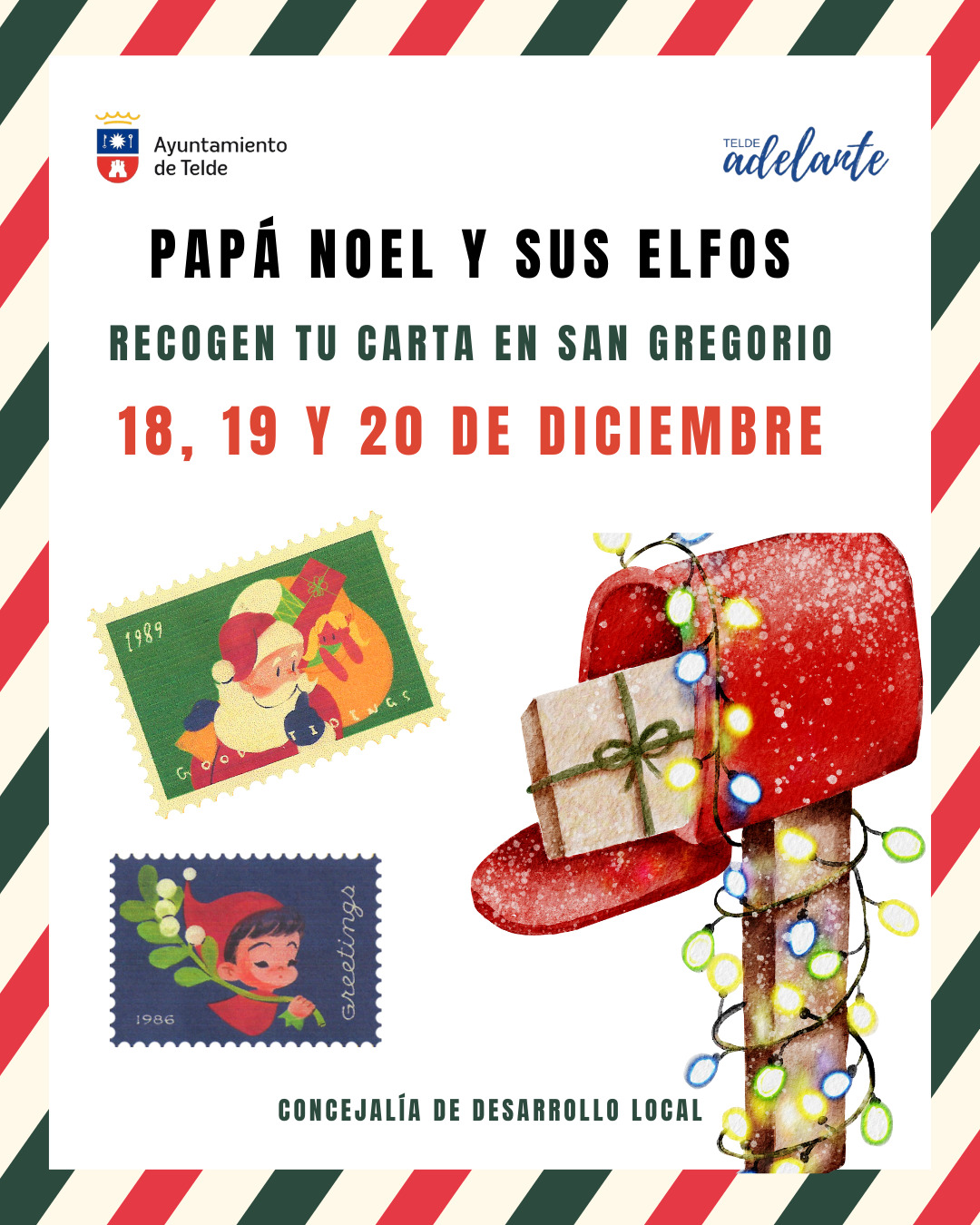 Una Navidad más, la magia y la ilusión se apoderarán de las calles de San Gregorio con la visita de Papá Noel y sus elfos. Este 18, 19 y 20 de diciembre el visitante del Polo Norte y sus ayudantes estarán recogiendo las cartas y tomándose fotos con los niños y niñas de Telde, una iniciativa enmarcada dentro de la campaña Teldelandia, donde los sueños se hacen realidad, impulsada por la Concejalía de Desarrollo Local, que dirige Nayra Navarro.