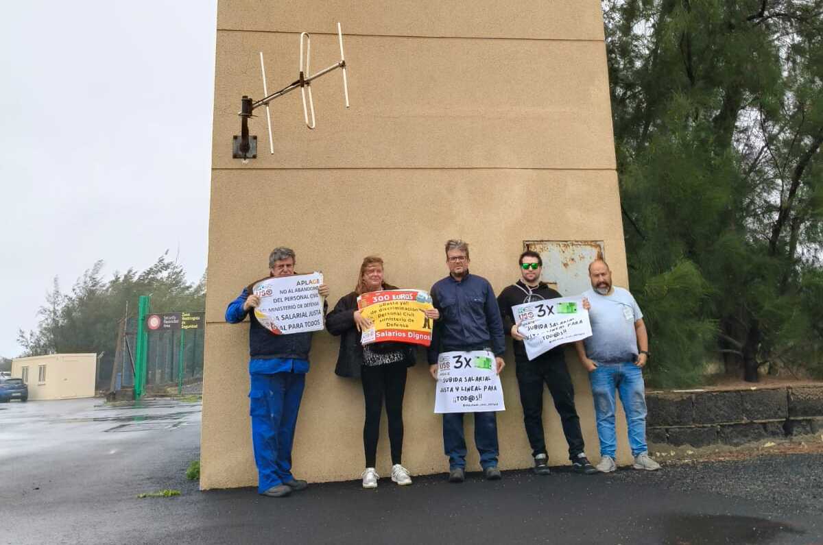 El personal civil de la Base Aérea de Gando volvió este miércoles a la carga para reivindicar mejoras en sus condiciones laborales. A pesar de la lluvia persistente durante buena parte de la mañana, una representación de los trabajadores se concentró a las puertas, como los afectados vienen realizando desde hace meses, a las puertas del recinto militar.