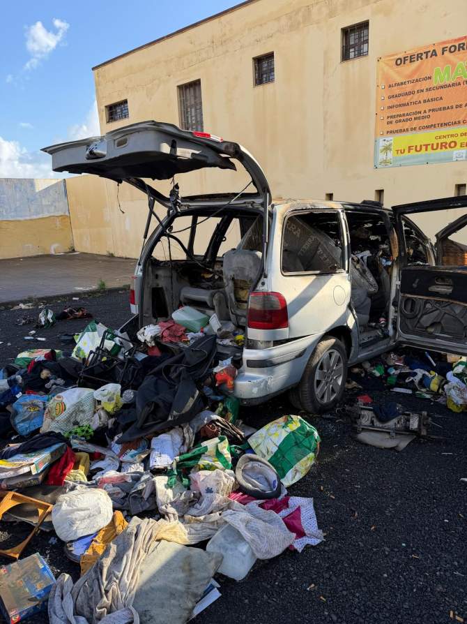 Según relatan los residentes, el vehículo se encuentra completamente destrozado, con claros signos de haber sufrido un incendio, y rodeado de basura quemada y esparcida, restos textiles, enseres y residuos, ofreciendo —afirman— una imagen “deplorable” en un espacio frecuentado a diario por alumnado y personal educativo.