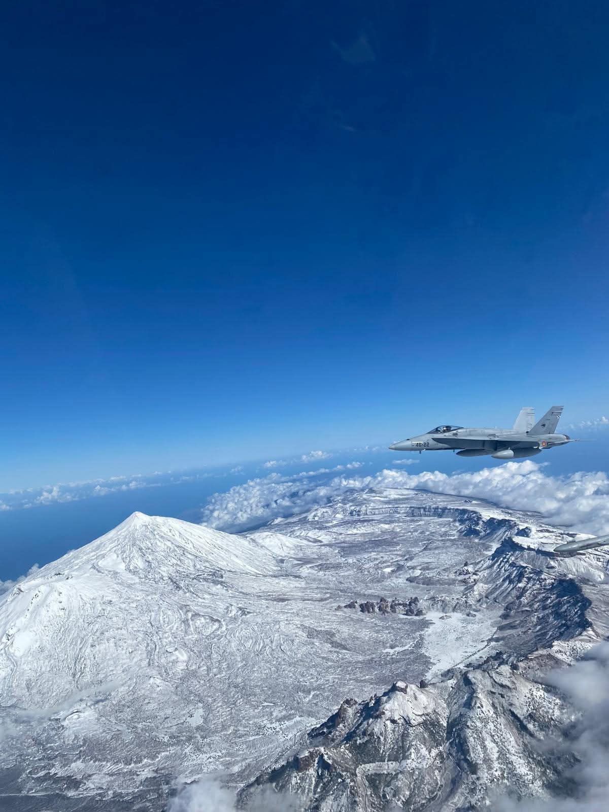 Las impresionantes imágenes del Ala 46 de la Base Aérea de Gando sobrevolando el Teide cubierto de nieve han despertado admiración entre los amantes de la aviación y la naturaleza. Las fotografías fueron captadas días atrás por un piloto desde otro caza durante una misión aérea, ofreciendo una perspectiva poco habitual del pico más alto de España en pleno invierno.