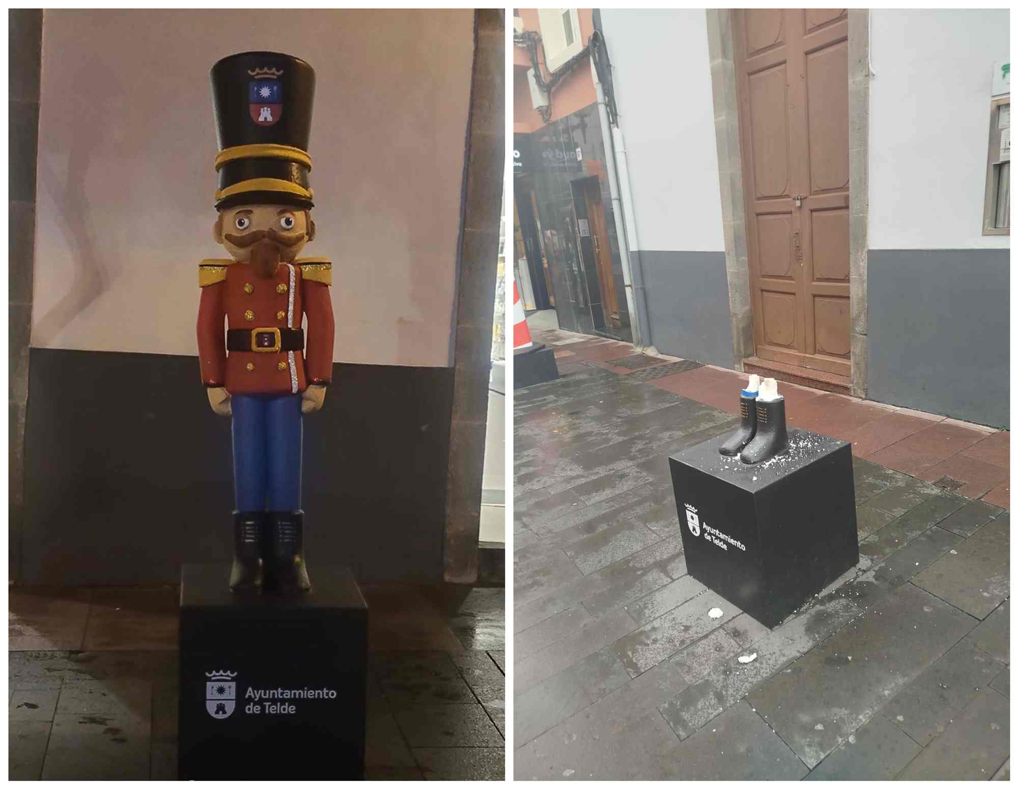 Según se aprecia en las imágenes, el muñeco fue arrancado violentamente de su base. La figura aparece completamente separada en dos partes: por un lado, el cuerpo del soldadito, que ya no se encuentra sobre el pedestal, y por otro, las botas, que permanecen solas sobre la peana negra con el logotipo del Ayuntamiento de Telde. En el suelo pueden observarse restos del material blanco del interior de la figura, esparcidos por la acera mojada.