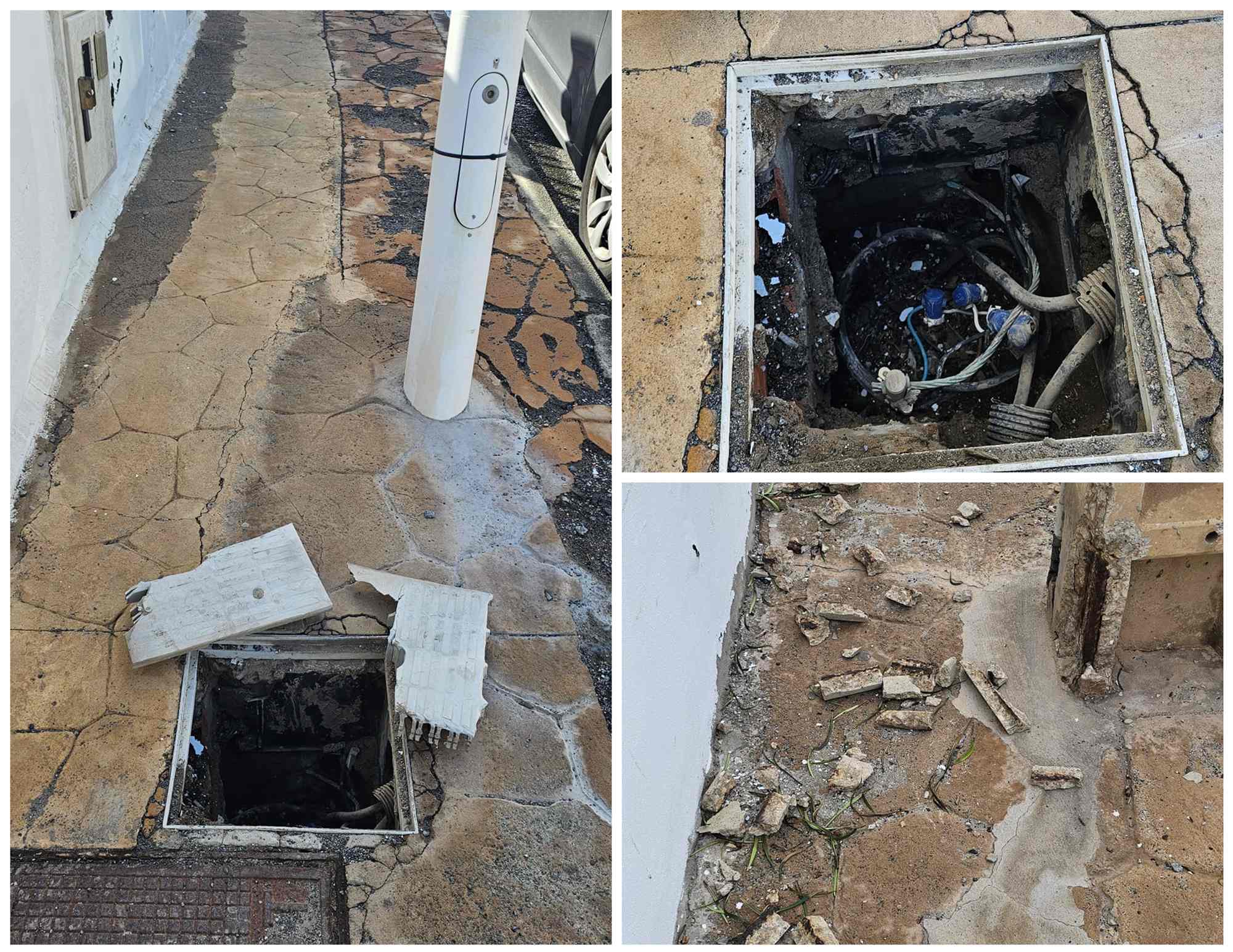 El primero de los problemas es una arqueta abierta, presuntamente vinculada a la red eléctrica, que ya ha provocado la caída de un vecino durante la mañana de este lunes. Aunque en un primer momento el afectado presentaba solo contusiones, los residentes permanecen pendientes de su evolución ante la posibilidad de lesiones de mayor gravedad.