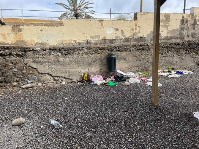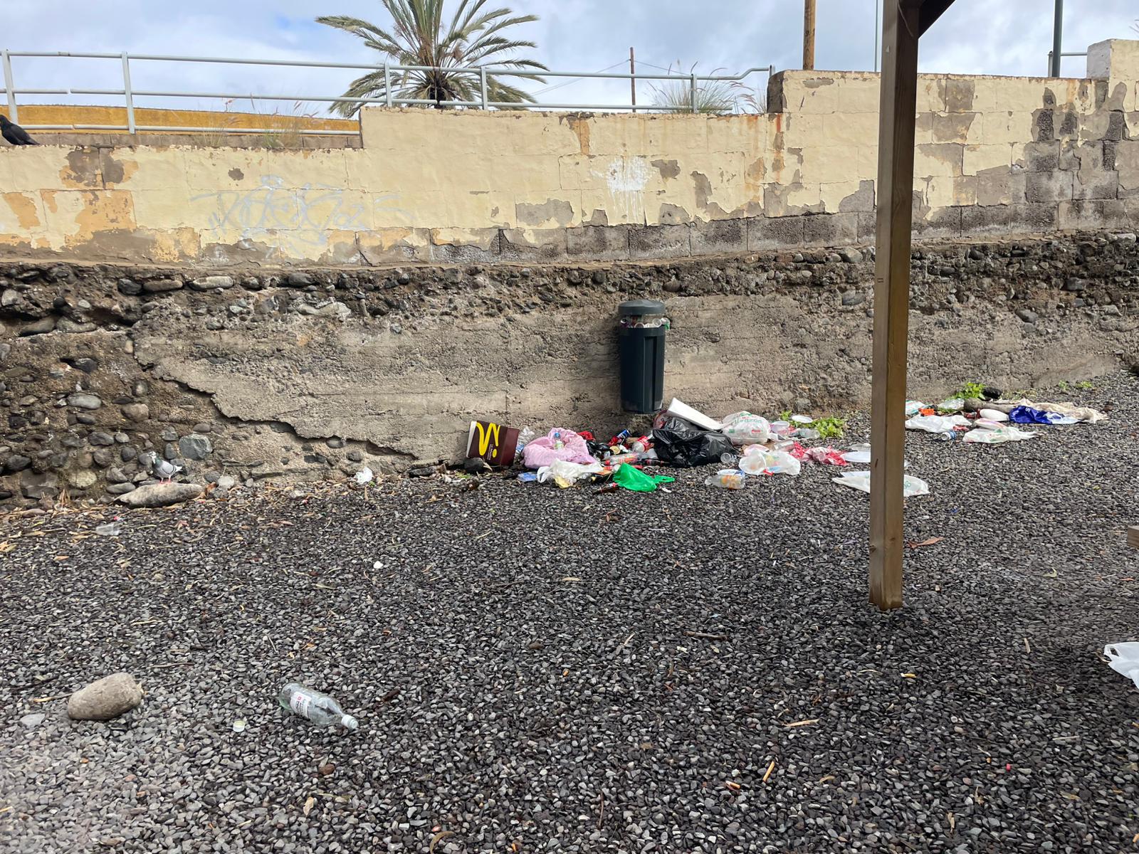 Las papeleras están llenas y la basura se esparce por este recinto ubicado junto al Puente de los Siete Ojos. Instan al Ayuntamiento de Telde a instalar contenedores de basura, de mayor capacidad que las papeleras, y a intensificar el servicio de limpieza.