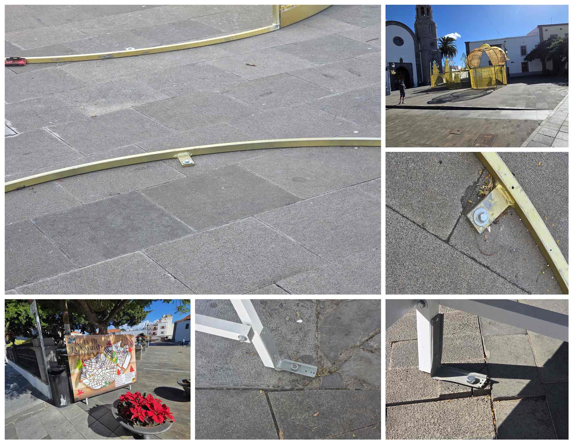 Según ha podido confirmar TELDEACTUALIDAD, se han realizado seis perforaciones —dos por cada pieza metálica iluminada— para fijar al suelo tres coronas navideñas, además de dos nuevos taladros para anclar el cartel indicativo de la Ruta de la Navidad. La intervención se justificó para evitar desplazamientos por el viento, pero se ha hecho a costa de dañar un pavimento histórico del entorno BIC de San Juan.
