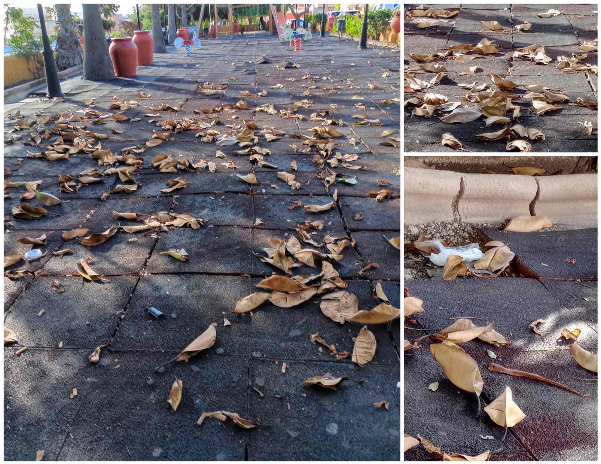 Según la denuncia vecinal y como se aprecia en las imágenes remitidas a TELDEACTUALIDAD, el parque presenta baldosas de caucho levantadas y desplazadas, muchas de ellas aparentemente sopladas por el viento, lo que genera zonas irregulares y peligrosas para el juego infantil. En el pavimento se observan además hojas secas, restos de suciedad y residuos, reflejo de una falta prolongada de limpieza y mantenimiento.