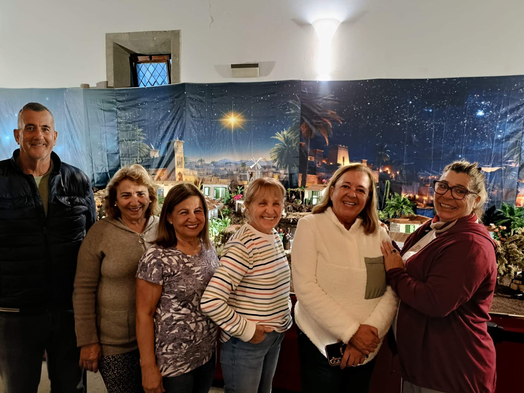 Ubicado en la parte izquierda del templo, el Nacimiento permanece custodiado por algunas de sus creadoras. “Se supone que tenemos que hacer turnos pero, al final, siempre nos vemos aquí más de las que tendríamos que estar”, afirma María del Mar Tejera. En el momento en el que se realiza este reportaje, a Tejera la acompañan Inma Torres, María del Carmen Hernández Santana, Inocencia Rivero y Rosa Santana. Minutos después se incorporaría Paco Rivero, pintor de profesión y encargado de la realización de las casas del Belén.