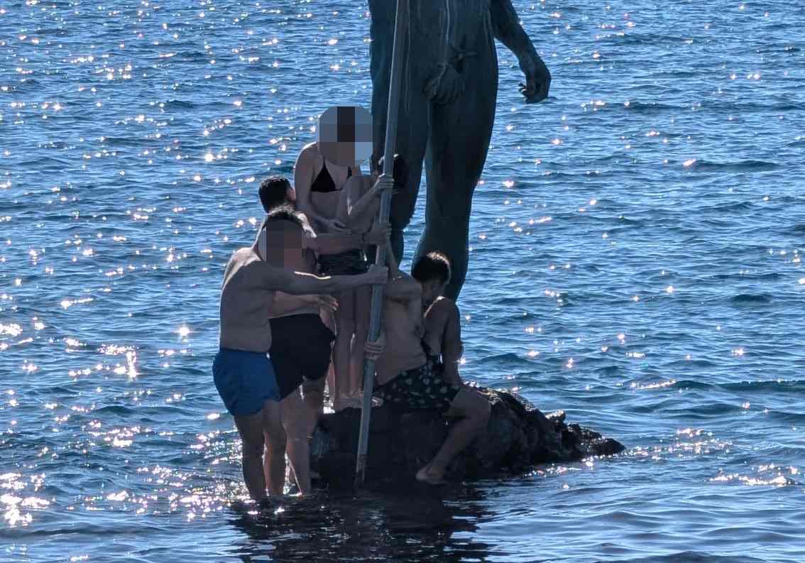 Tal y como muestra la imagen remitida a la redacción, varias personas, entre ellas menores, se encaraman a la base y al tridente de la escultura, situada sobre una roca (El Puntón) en el mar, convertida en uno de los iconos visuales de la playa de Melenara. La escena, según residentes habituales, se repite con frecuencia en días de buen tiempo y mar tranquila.