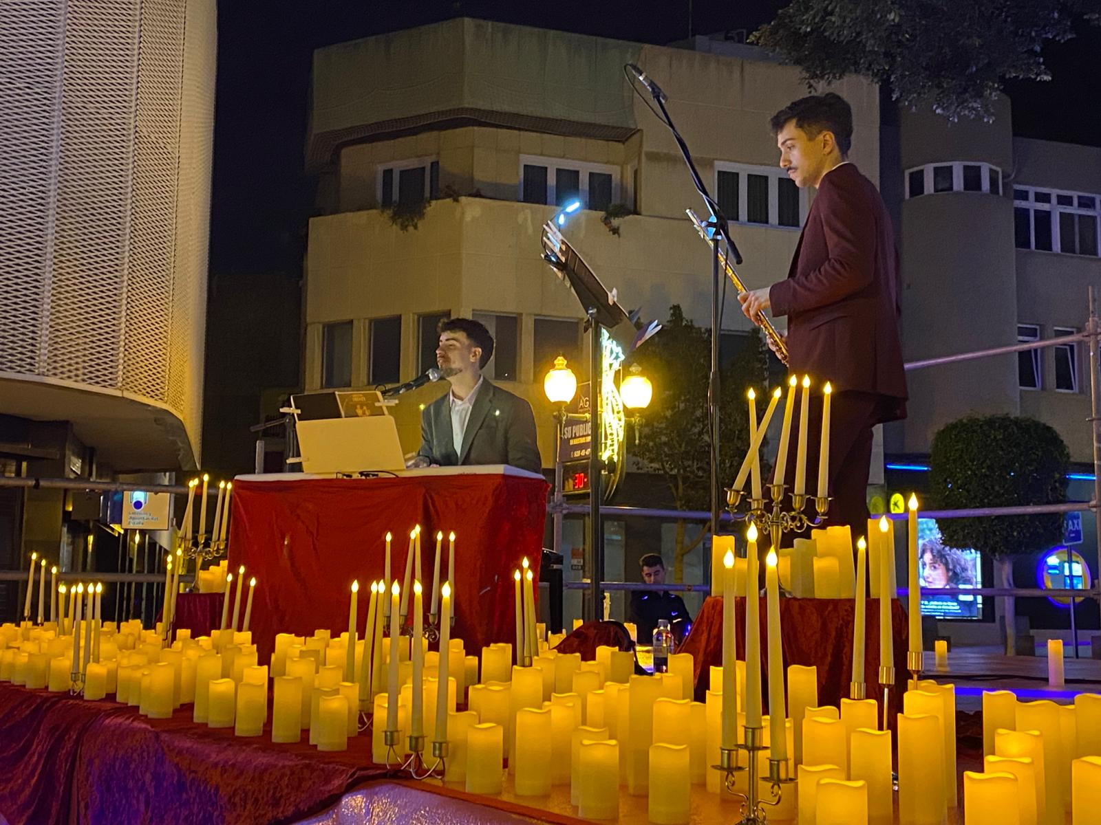 El proyecto, creado por el cantante lírico David Bautista y acompañado por el flautista Alejandro Cardona, propone una experiencia musical cercana y envolvente. Más de 500 velas marcaron la atmósfera del concierto, generando un entorno cálido que transformó la plaza en un escenario singular, donde cada nota se vivió con especial intensidad.