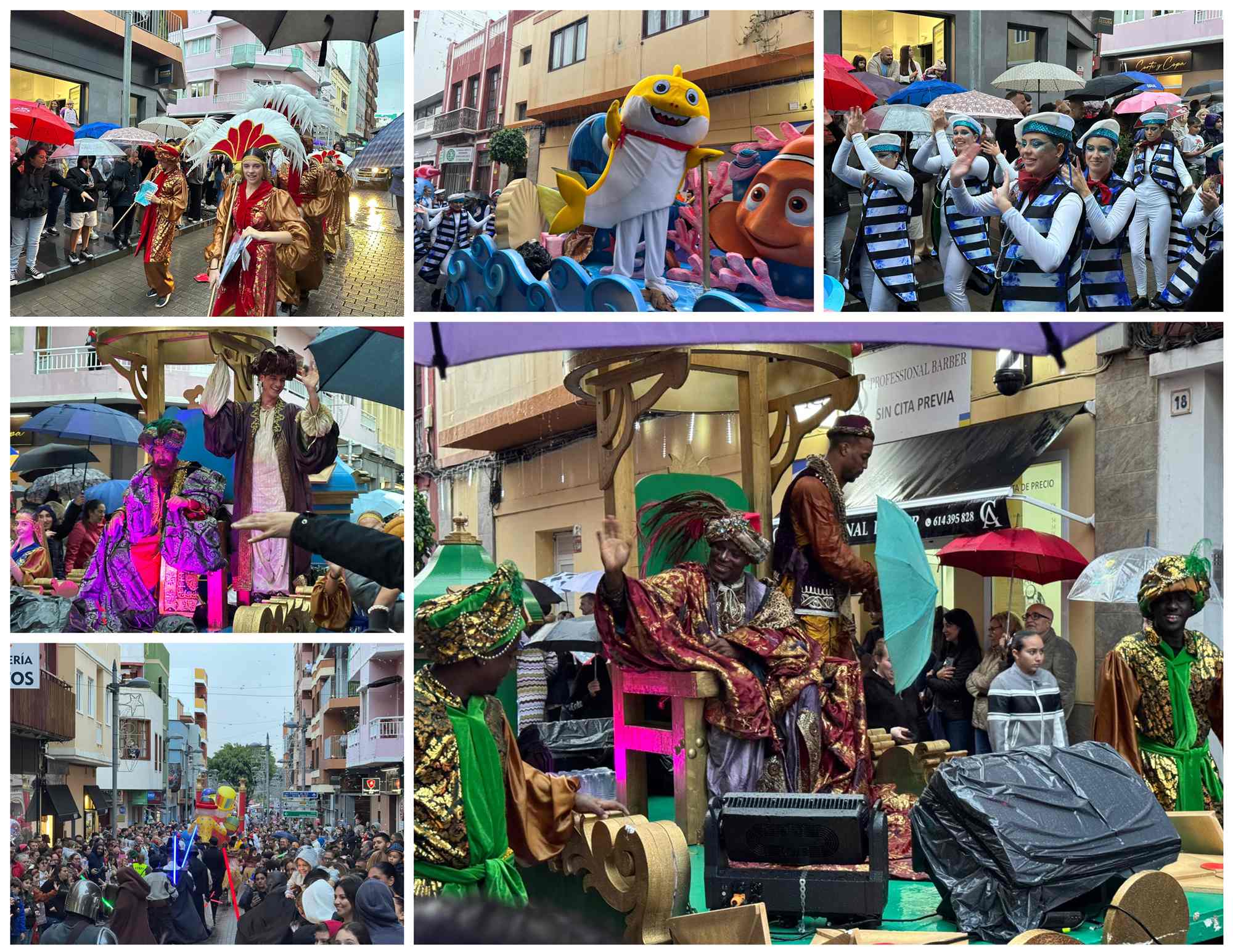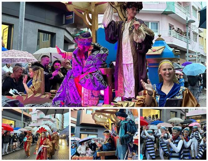 Si la recepción oficial de la mañana estuvo marcada por la lluvia, la Cabalgata Real de este lunes en Telde demostró que ni el cielo gris puede con la ilusión. Pasadas las 17.00 horas, la comitiva de Sus Majestades los Reyes Magos de Oriente inició su recorrido y, aunque sufrió varios chaparrones a lo largo del trayecto, las calles se mantuvieron abarrotadas de familias de todas las edades que no quisieron perderse el paso real.