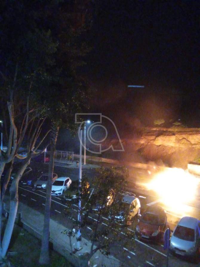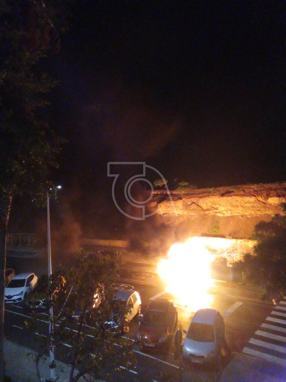 En la fotografía remitida a la redacción se observa cómo las llamas envuelven por completo el contenedor, situado en plena calzada junto a otros recipientes y vehículos estacionados. El fuego alcanza varios metros de altura e ilumina la vía pública, mientras el resplandor anaranjado se proyecta sobre el talud de tierra que bordea la calle. A escasos metros se aprecian coches aparcados y un paso de peatones, lo que evidencia el riesgo para personas y bienes si el incendio se hubiera propagado.