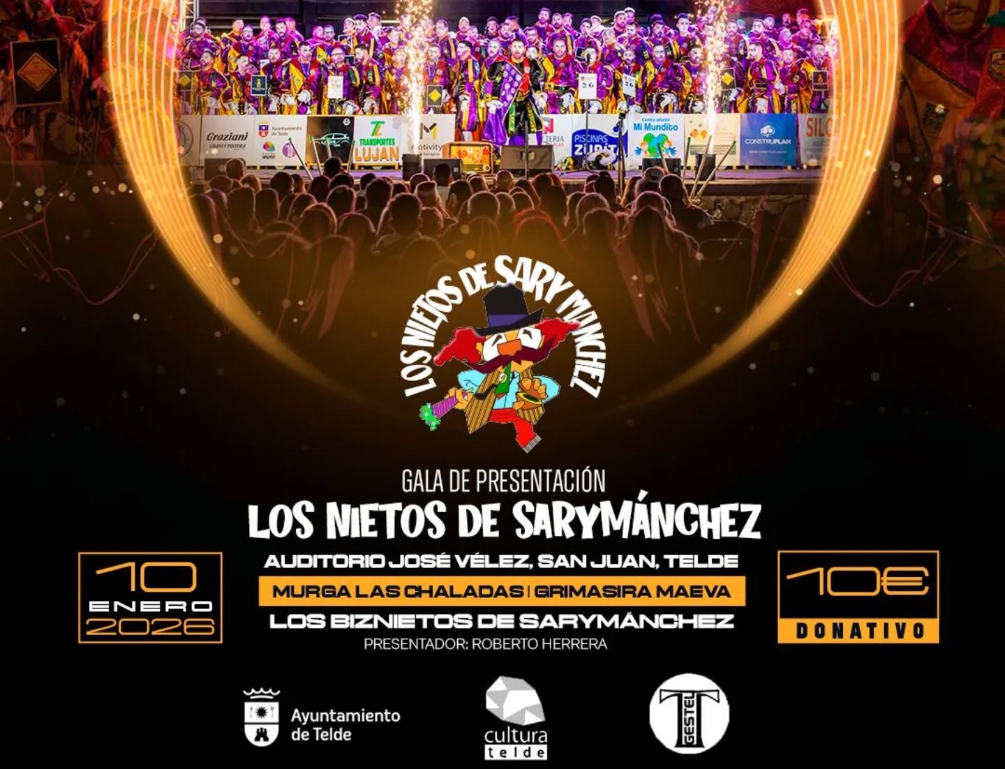 La murga Los Nietos de Sarymánchez celebrará este sábado, 10 de enero, su esperada gala de presentación en el Auditorio José Vélez, en el parque urbano de San Juan (Telde). El acto comenzará a las 20.00 horas y marca el inicio de la temporada carnavalera para una de las formaciones más reconocidas del panorama murguero de Gran Canaria.