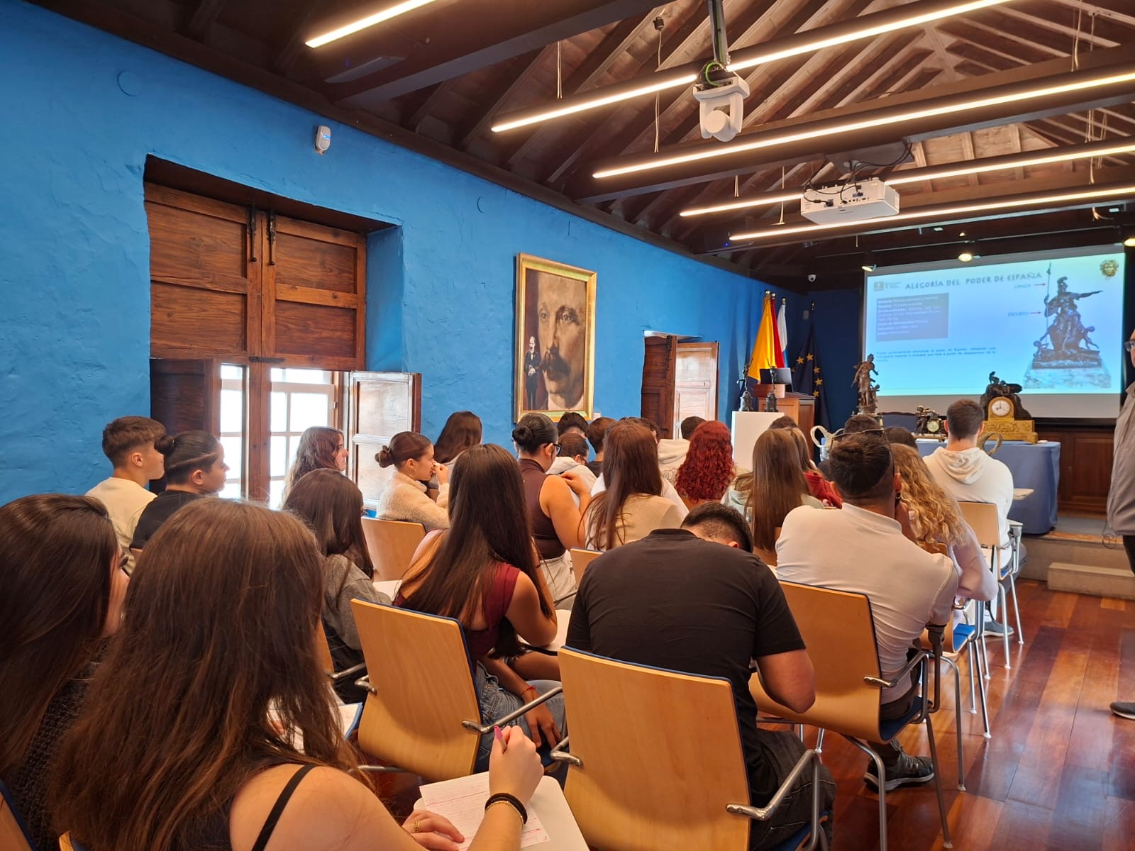 La primera jornada tuvo lugar en Gran Canaria, donde el alumnado del IES Anaga se desplazó para realizar una ruta cultural junto al alumnado del IES José Arencibia Gil. El recorrido comenzó en Telde, con la visita a la Casa-Museo León y Castillo, donde Juan Ismael Santana Ramírez, técnico del museo, ofreció una interesante charla sobre los numerosos elementos mitológicos presentes en el edificio. El alumnado fue el primero en conocer los resultados de varios meses de investigación sobre relojes decorados con escenas y figuras de la Antigüedad clásica, como la despedida de Héctor y Andrómaca.