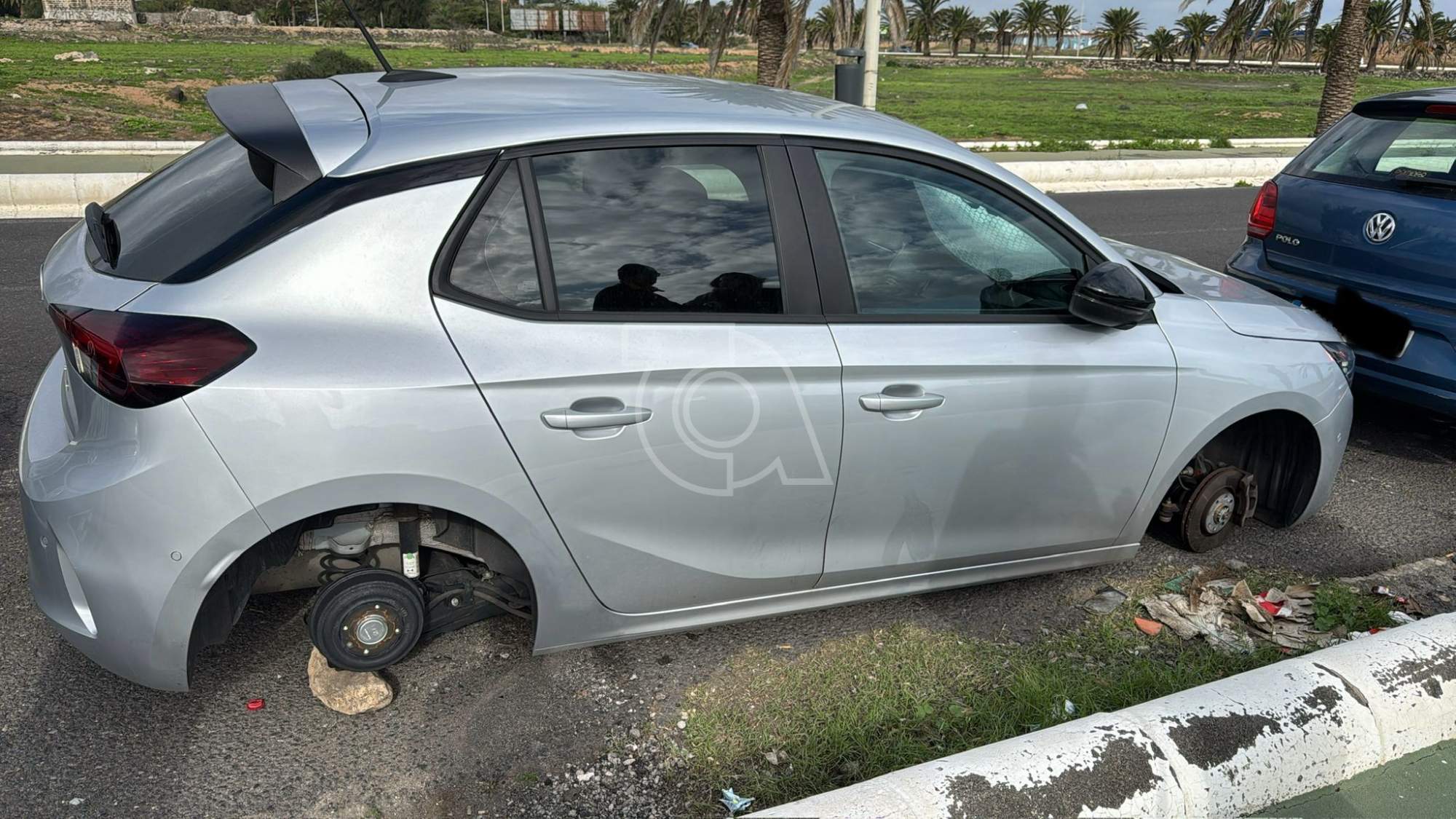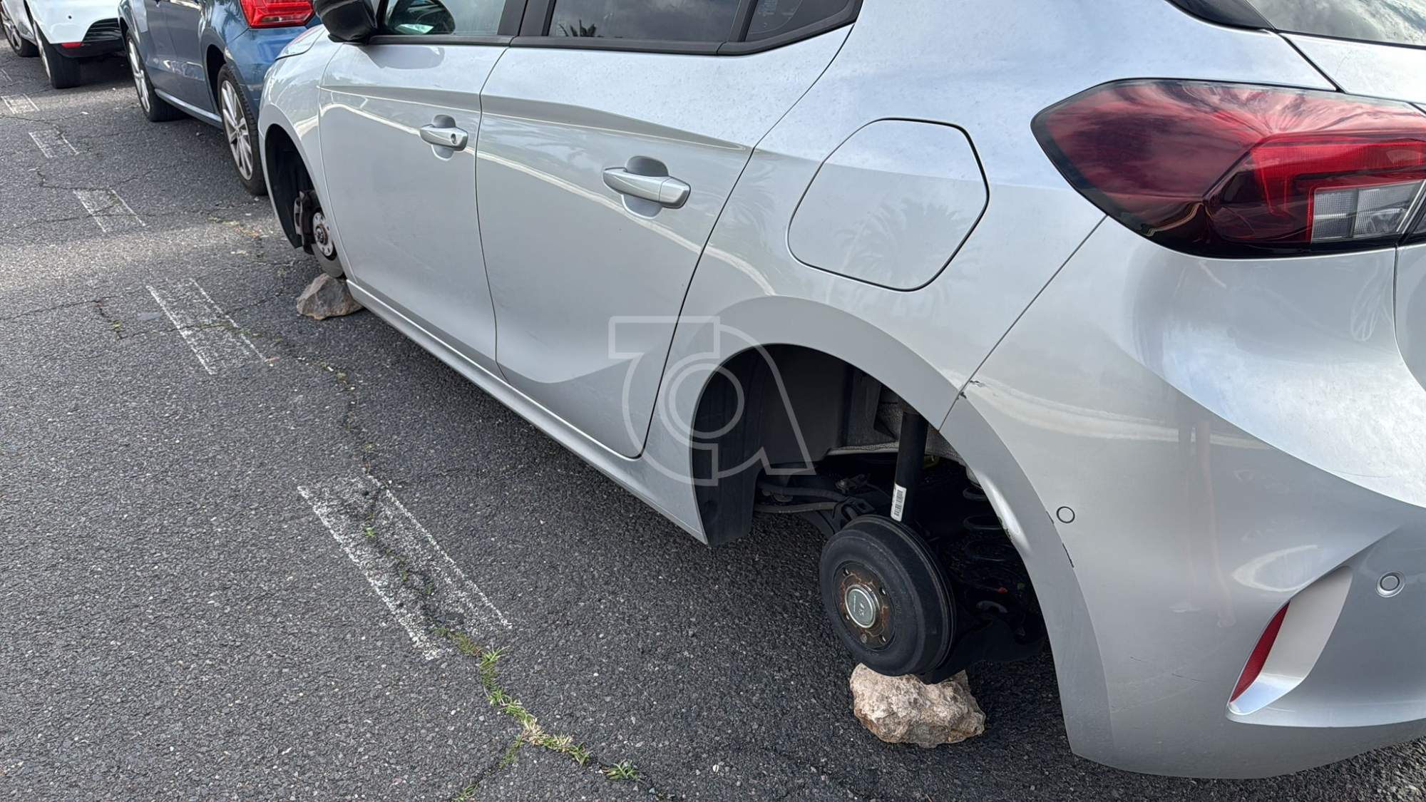En una de las fotografías remitidas a esta redacción por uno de los afectados se aprecia un turismo de color gris completamente apoyado sobre piedras tras el robo de las cuatro ruedas, quedando los ejes al descubierto y el vehículo inservible. El coche permanecía junto al bordillo, rodeado de restos de suciedad y piezas, una estampa que refleja la violencia del acto delictivo.