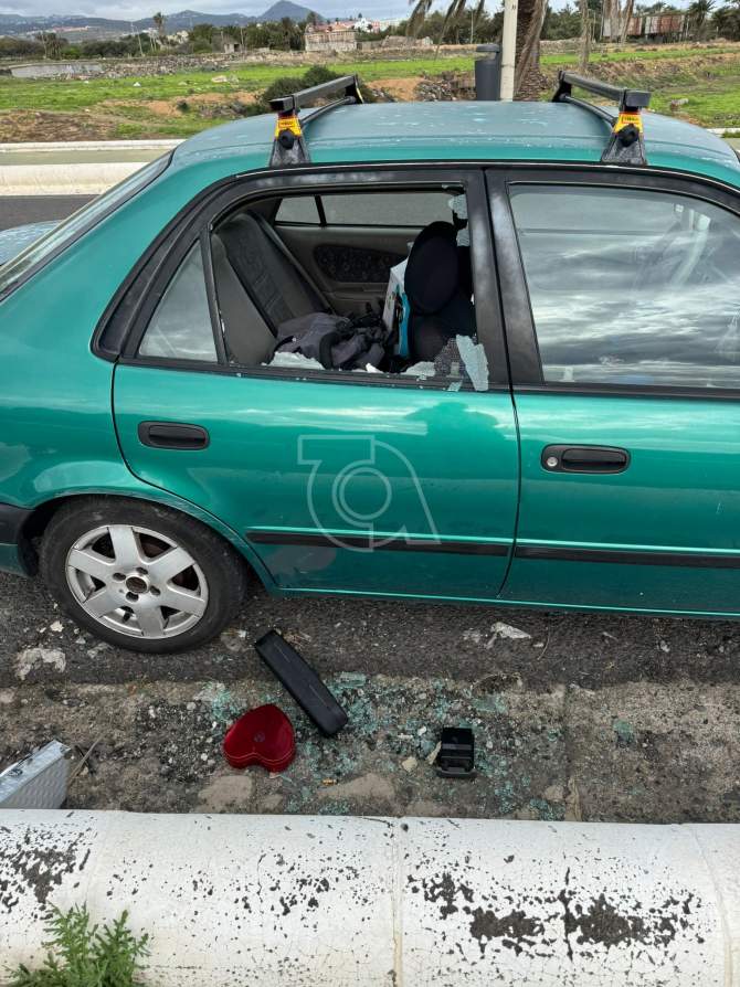 Otra de las imágenes muestra un turismo verde con la ventanilla trasera reventada, cristales esparcidos por el asfalto y diversos objetos tirados en el suelo, señal de que los autores registraron el interior del vehículo en busca de pertenencias. El propietario encontró el coche con el interior revuelto y daños visibles en la carrocería.