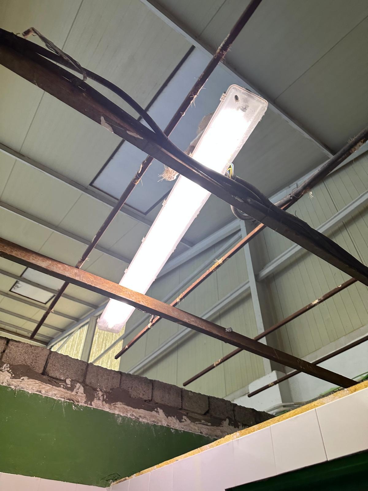La queja se centra en el estado del techo del recinto y en las dependencias destinadas a uso sanitario. En el interior del pabellón se observan elementos del techo con partes visibles de la estructura y de las instalaciones, así como zonas sin cerramiento completo en la parte superior del espacio.
