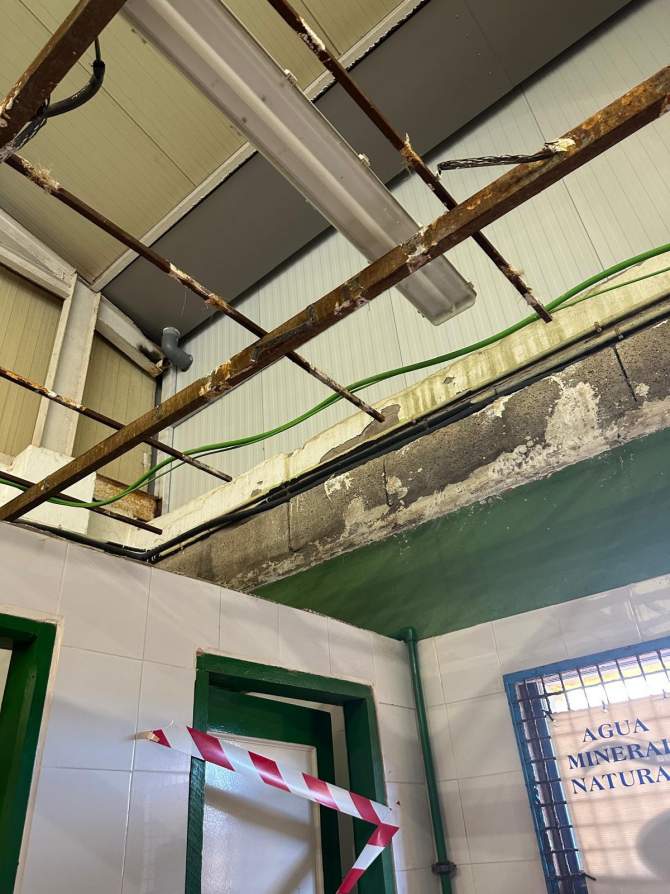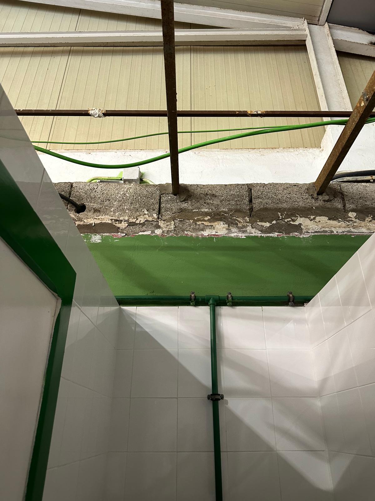 Estado de los baños y parte del techo del pabellón Antonio Moreno (Fotos cedidas)Usuarios del pabellón insular Antonio Moreno, casa deportiva del CB Remudas IGC, han registrado un queja formal en el Ayuntamiento de Telde por el "mal estado" del techo y los baños.