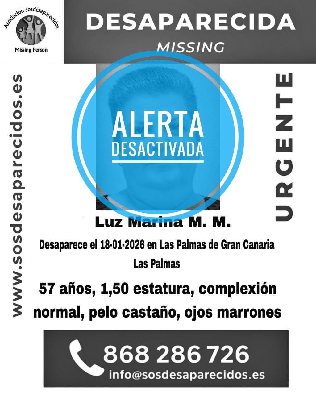 La Asociación SOS Desaparecidos ha comunicado en las últimas horas la desactivación de la alerta emitida el pasado 18 de enero para localizar a Luz Marina M. M., una mujer de 57 años desaparecida en Las Palmas de Gran Canaria. La organización ha actualizado su cartel informativo añadiendo el distintivo de “alerta desactivada”, cerrando oficialmente el dispositivo de búsqueda.