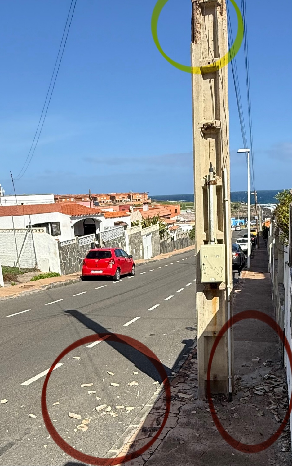 Vecinos de la calle Lope de Vega, en Playa del Hombre, han trasladado su "profunda preocupación" por el estado de varios elementos de la vía pública y "por el riesgo que supone para peatones y residentes" por desprendimientos de una instalación de alumbrado, la presencia de cableado y una tapa de electricidad rota.