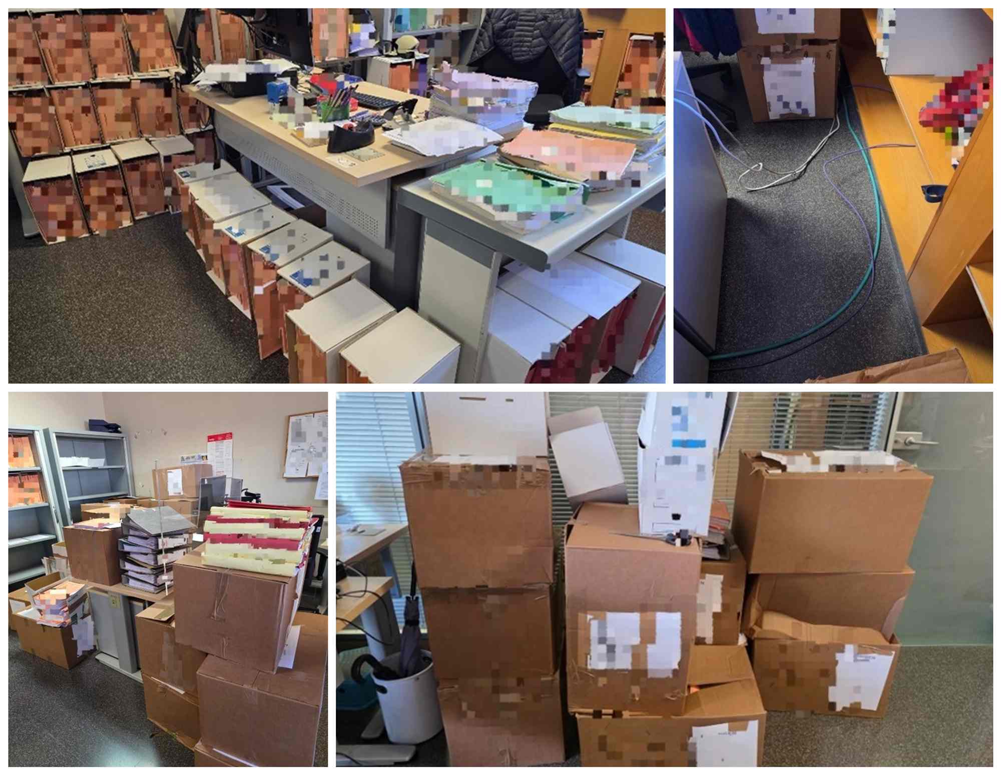 La situación más problemática, según el sindicato, se concentra en el Servicio Común de Ejecución, ubicado en la tercera planta. Diez trabajadores gestionan unas 15.000 ejecuciones civiles. La reciente mudanza ha generado acumulación de expedientes, cajas sin abrir y espacios de trabajo saturados.