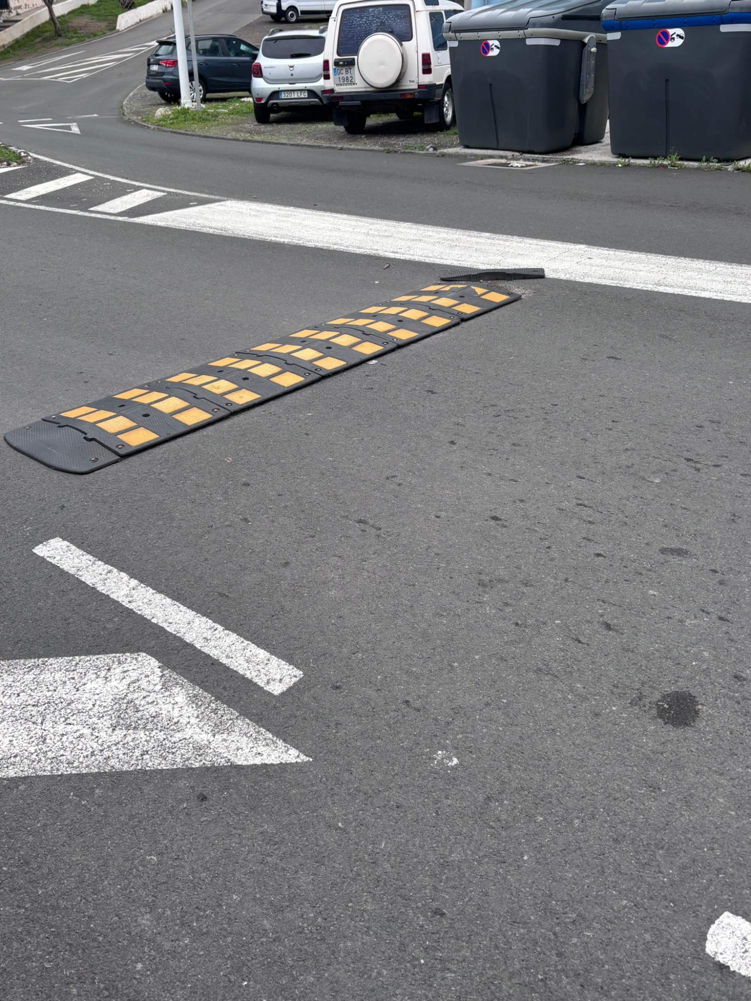 Vecinos de Valle de Jinámar denuncian desperfectos en las bandas reductoras de velocidad que se encuentran instaladas en la calle Fernando Sagaseta, a la altura del bloque número 61. Explican que parte de estos dispositivos se han aflojado y los tornillos permanecen en la vía pública, lo que supone un peligro para la seguridad vial.
