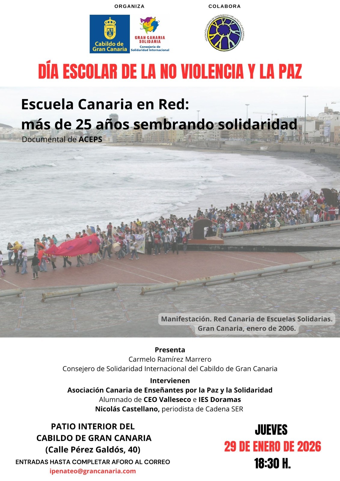 El Cabildo de Gran Canaria acogerá este jueves, 29 de enero, la presentación del documental Escuela Canaria en Red: más de 25 años sembrando solidaridad, una producción impulsada por la Asociación Canaria de Enseñantes por la Paz y la Solidaridad (ACEPS) que recoge más de dos décadas de trabajo educativo en red en favor de la solidaridad, la cooperación y la cultura de paz en los centros educativos de Canarias.