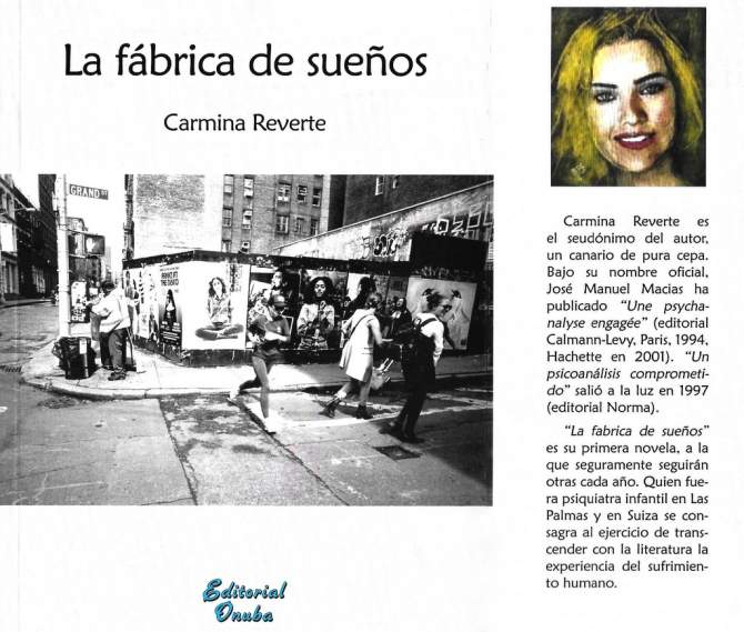 Con el título La fábrica de sueños novela que con el seudónimo de Carmina Reverte fue presentada la tarde del jueves 29 en la Casa Museo León y Castillo de Telde, obra de la editorial Onuba, 2025, cuya autoría se debe al escritor canario José Manuel Macías, opera prima de un trabajo de quien fuera psiquiatra infantil en Las Palmas y en Suiza que traslada sus experiencias y conocimientos al ejercicio literario con la historia novelada basada en el desarrollo y amplio campo generado por el ser humano y su posición ante el sufrimiento.