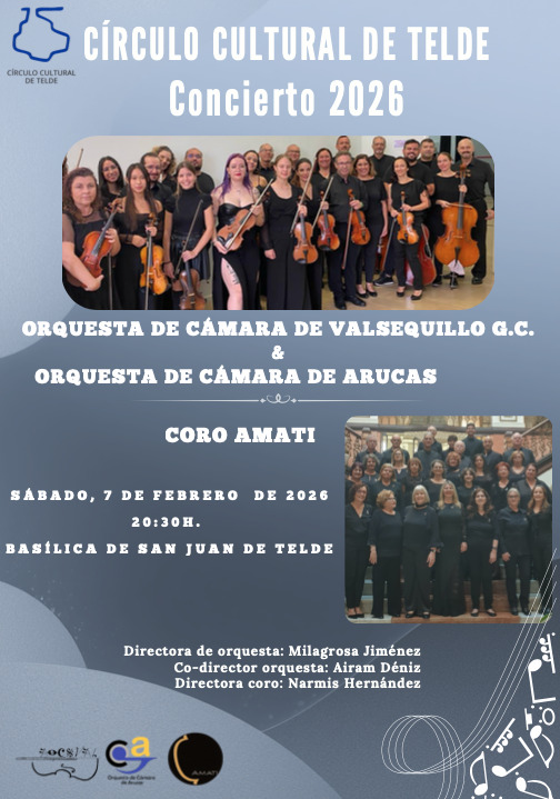 Las orquestas de cámara de Valsequillo y Arucas han demostrado a lo largo de los años su firme compromiso con la difusión de la música instrumental y la colaboración artística en Gran Canaria, como ya quedó patente en anteriores actuaciones conjuntas organizadas por el Círculo Cultural de Telde en este mismo templo. Por su parte, la Coral Amati, con una sólida trayectoria en encuentros y eventos corales de la isla, aportará su sensibilidad interpretativa y su vocación de cercanía con el público.