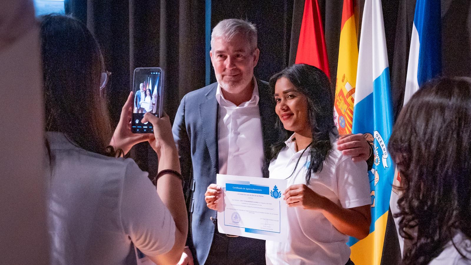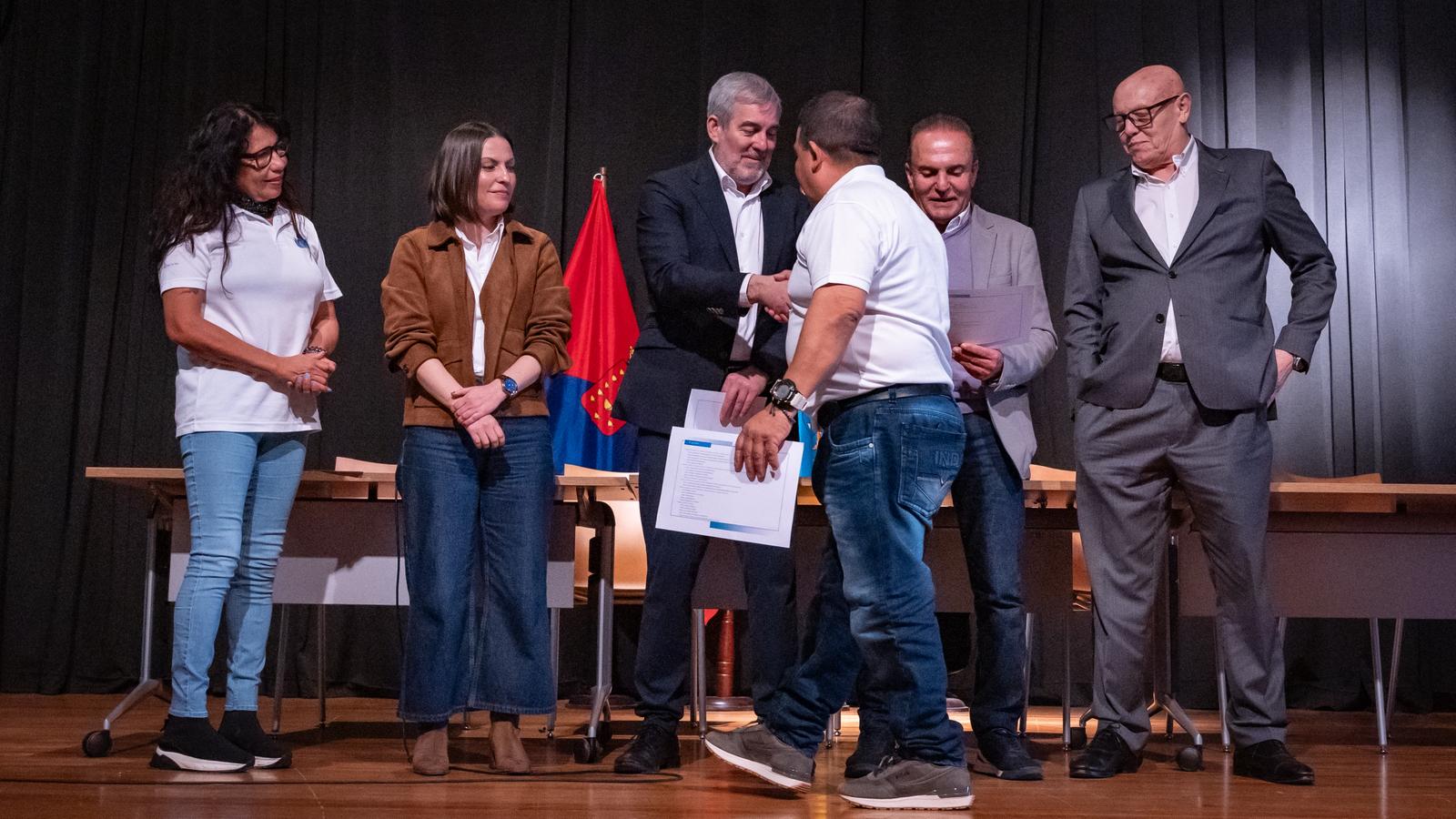 Clavijo participó en el acto de entrega de certificados, al que también asistió la consejera de Universidades, Ciencia e Innovación y Cultura, Migdalia Machín, a las quince personas que han completado el primer ciclo de formación de la Escuela de Cuidados del proyecto Rural Domus, una iniciativa pionera impulsada por el Servicio Canario de la Salud (SCS) en colaboración con la Orden Hospitalaria San Juan de Dios.