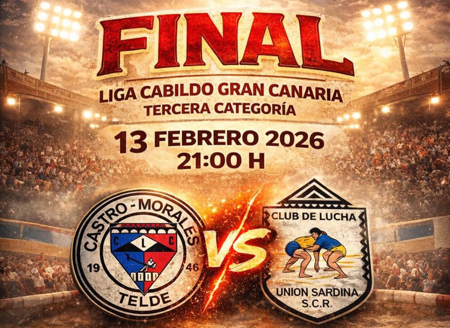 El Club de Lucha Castro Morales de Telde disputa este viernes día 13 de febrero la Final de la Liga Cabildo de Gran Canaria de Tercera Categoría. Se medirá, a partir de las 21.00 horas, al Unión Sardina en el Terrero Las Crucitas, en Agüimes, en una cita decisiva que culmina una temporada de esfuerzo, constancia y compromiso.