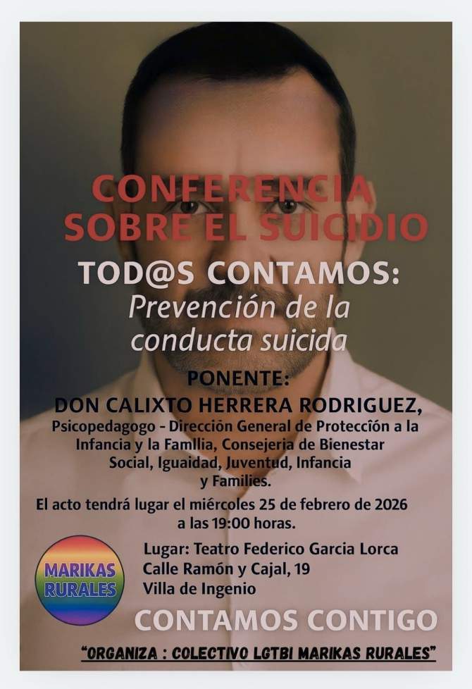 La prevención de la conducta suicida será el eje central de una conferencia abierta a toda la ciudadanía que se celebrará el miércoles, 25 de febrero, a las 19:00 horas, en el Centro Cultural Federico García Lorca de la Villa de Ingenio. La iniciativa está organizada por el colectivo Marikas Rurales y se enmarca bajo el lema “Tod@s contamos: prevención de la conducta suicida”.