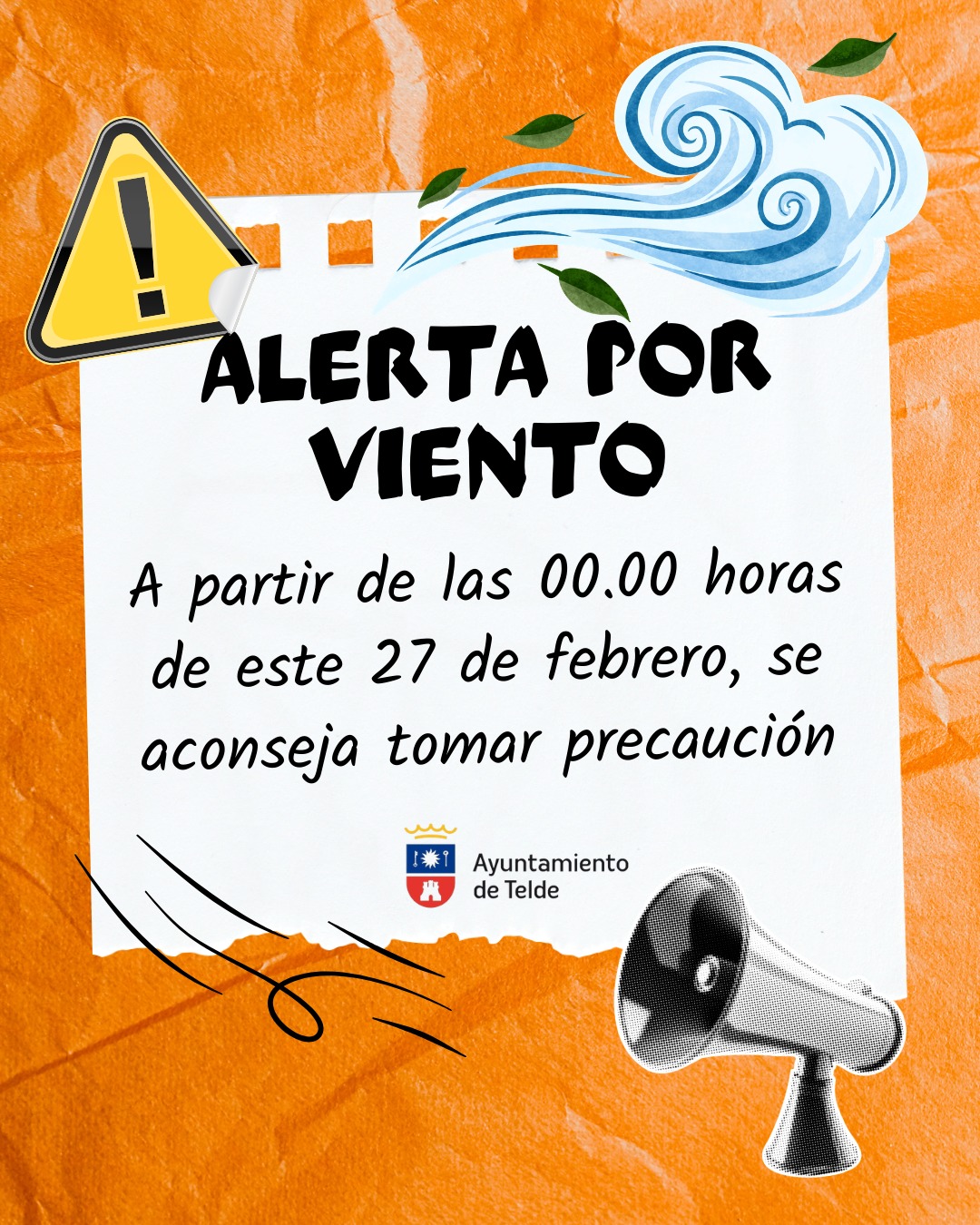 El Ayuntamiento de Telde informa que, según la Dirección General de Emergencias del Gobierno de Canarias y el Plan Específico de Protección Civil (PEFMA), se actualiza la situación y se declara a alerta por viento en Gran Canaria a partir de las 00.00 horas de este 27 de febrero.