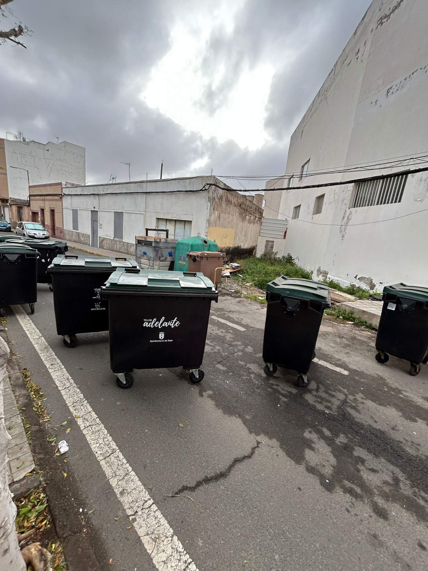 El viento sopla con intensidad sobre el municipio y está provocando diversas incidencias, hasta ahora sin gravedad, en varios puntos de su geografía. Como por ejemplo en el barrio de La Fonda, en El Calero, donde ha desplazado varios contenedores de basura que han acabado bloqueando la carreterra.