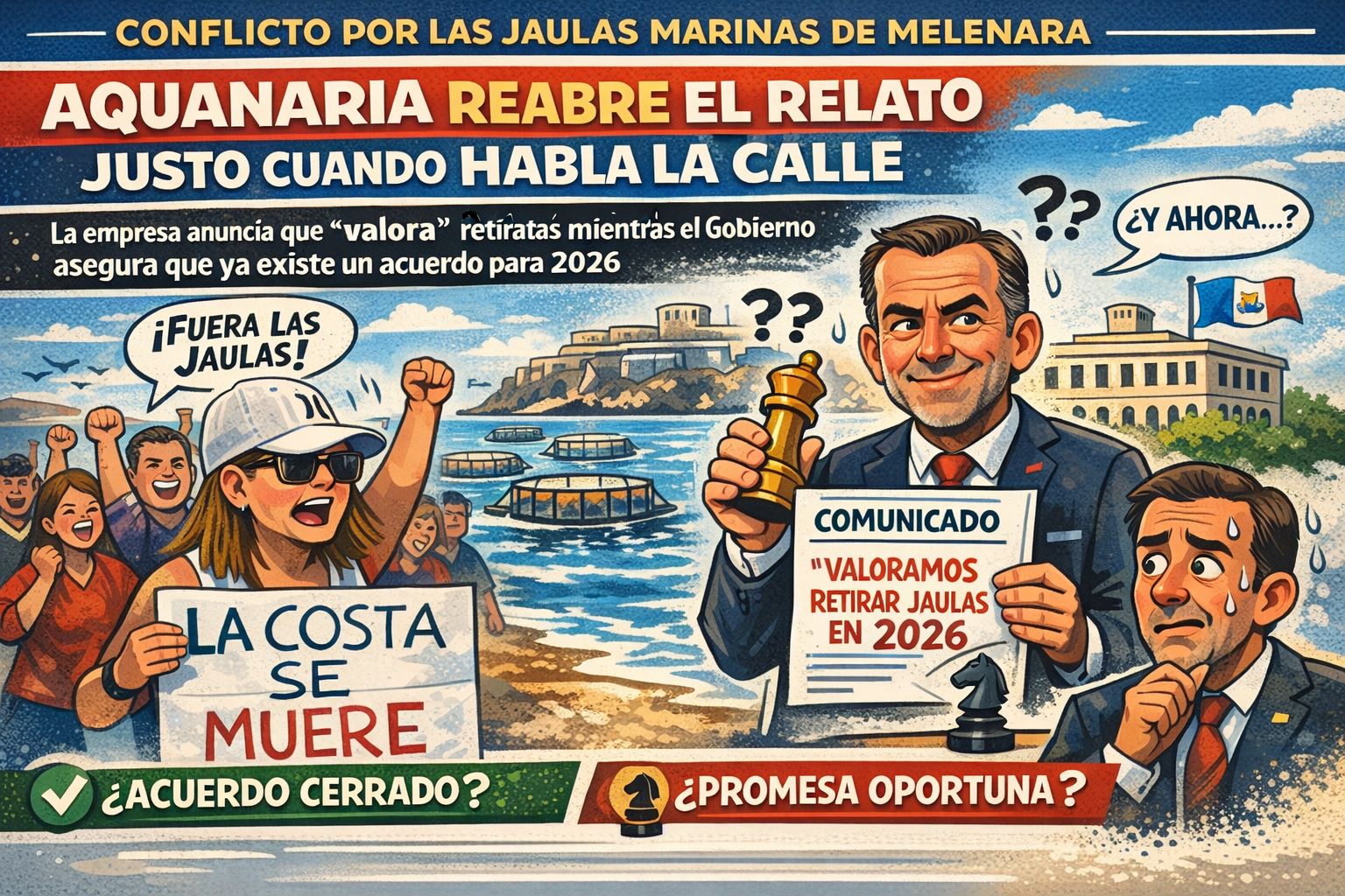 Cada vez que la Plataforma Ciudadana por un Mar Limpio logra colocar el debate en la agenda pública, la empresa acuícola vuelve a aparecer en escena con un nuevo anuncio. No es casualidad, sino un patrón que se repite desde la primera gran movilización vecinal, cuando más de 2.000 personas recorrieron el litoral de Melenara, Clavellinas y Salinetas reclamando la retirada de las jaulas marinas.