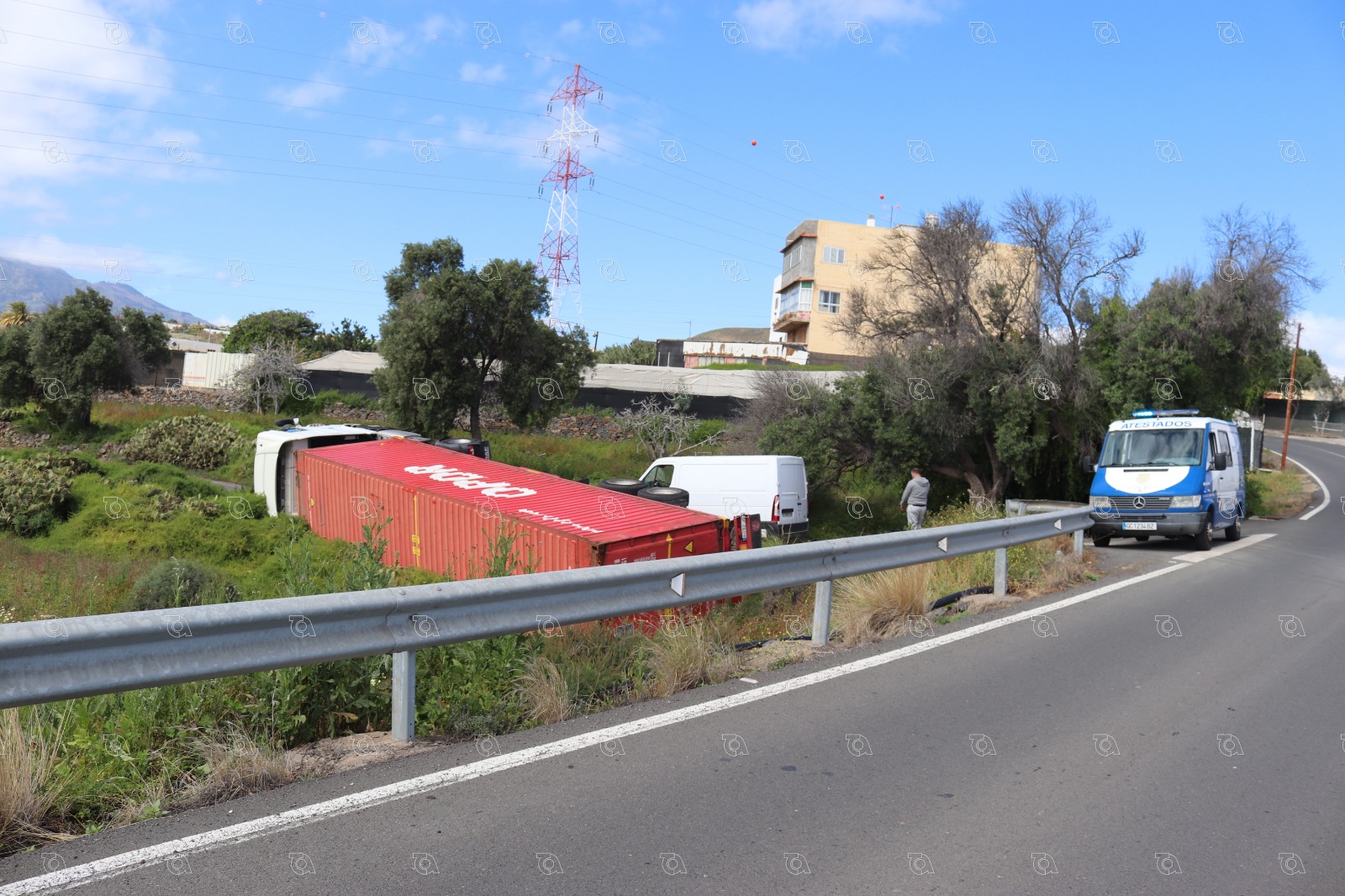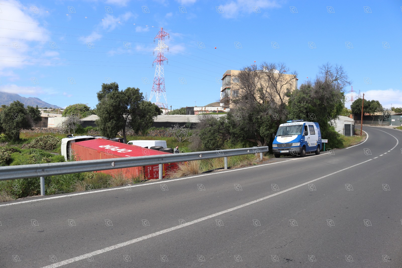 Un camión articulado ha sufrido un vuelco este lunes, sobre las 11.00 horas, en un camino anexo a la carretera de Los Picos (GC-130). Hasta la zona se han desplazado bomberos del Consorcio de Emergencias, una ambulancia del Servicio de Urgencias Canario (SUC) y efectivos de l aPolicía Local de Telde.