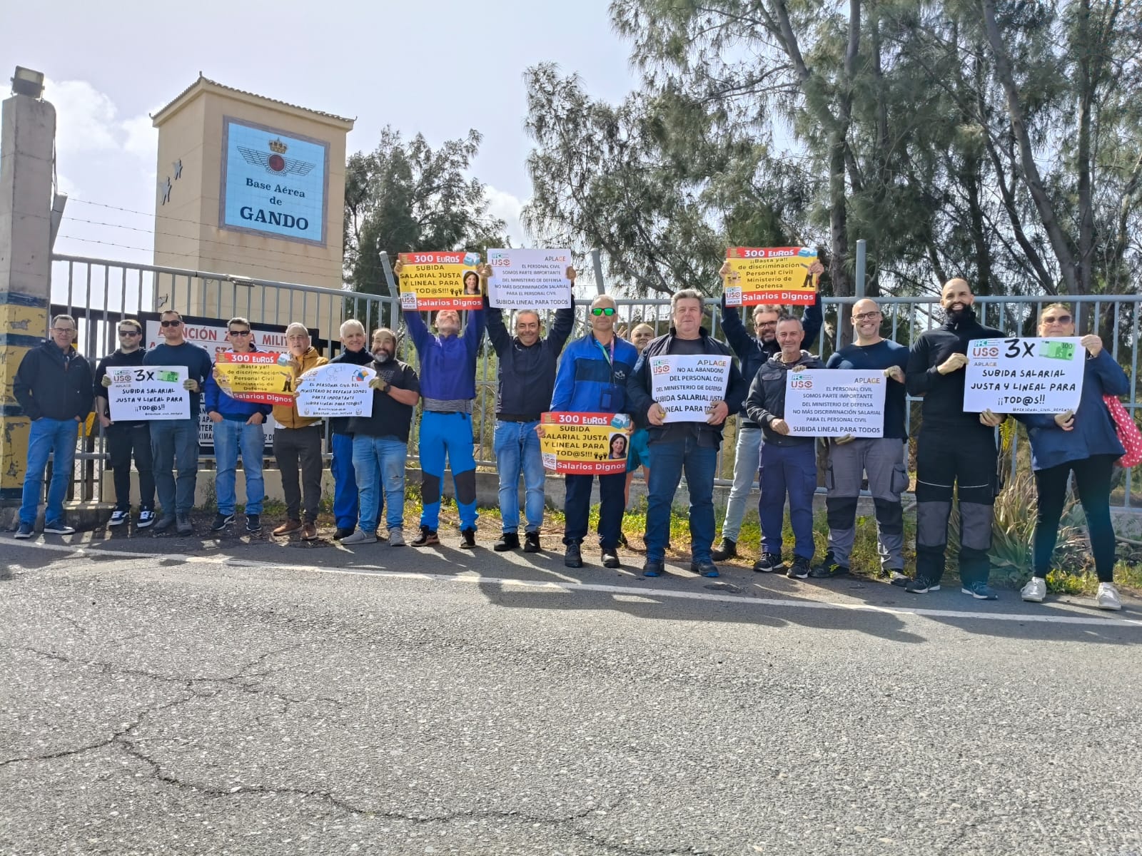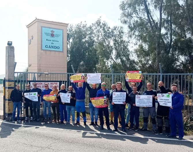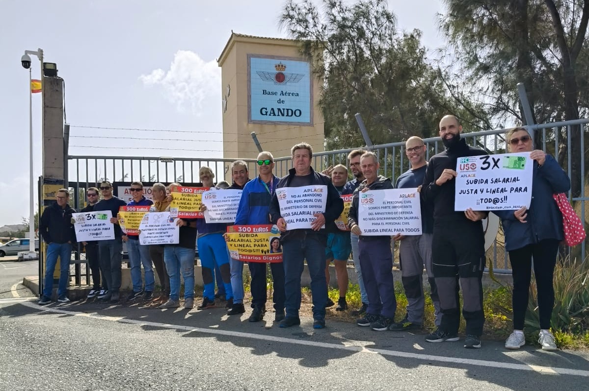 El personal civil de la Base Aérea de Gando se concentró este miércoles para reclamar al Ministerio de Defensa una subida salarial lineal y consolidada de 300euros, según informó el colectivo en un comunicado difundido con el apoyo y la coordinación de USO y APLAGE.
