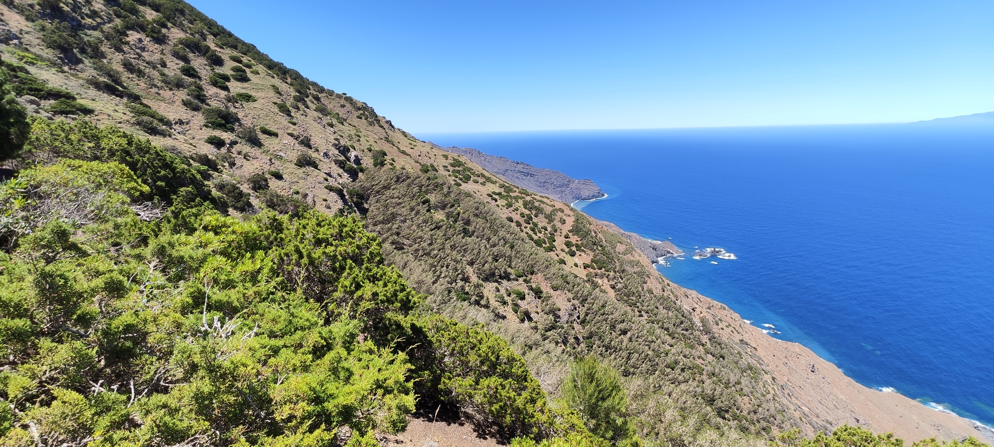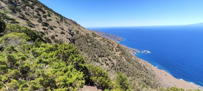 Plantaciones de pino carrasco (manchas de vegetación más densa) en laderas cubiertas de sabina. Costa del noroeste de La Gomera.