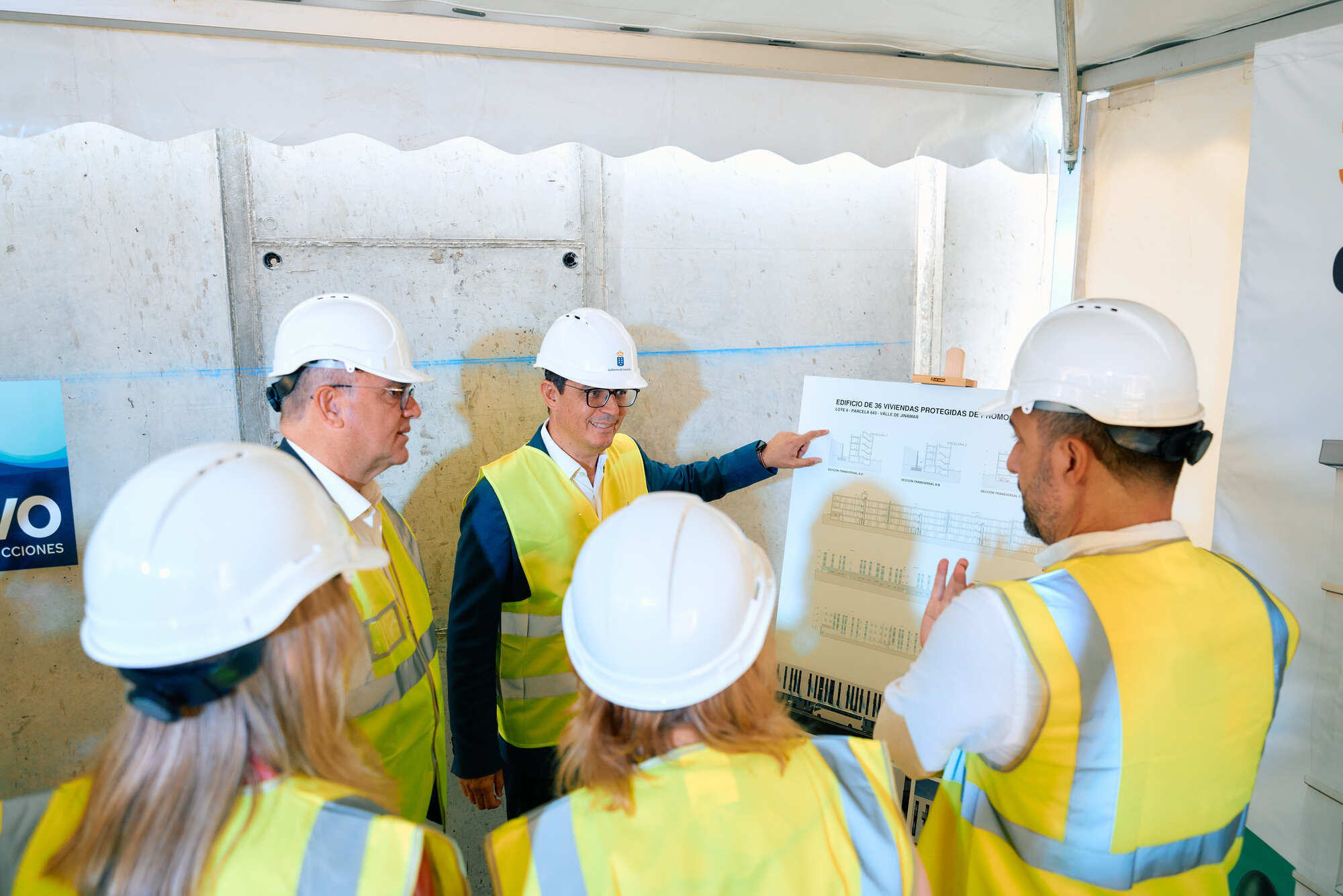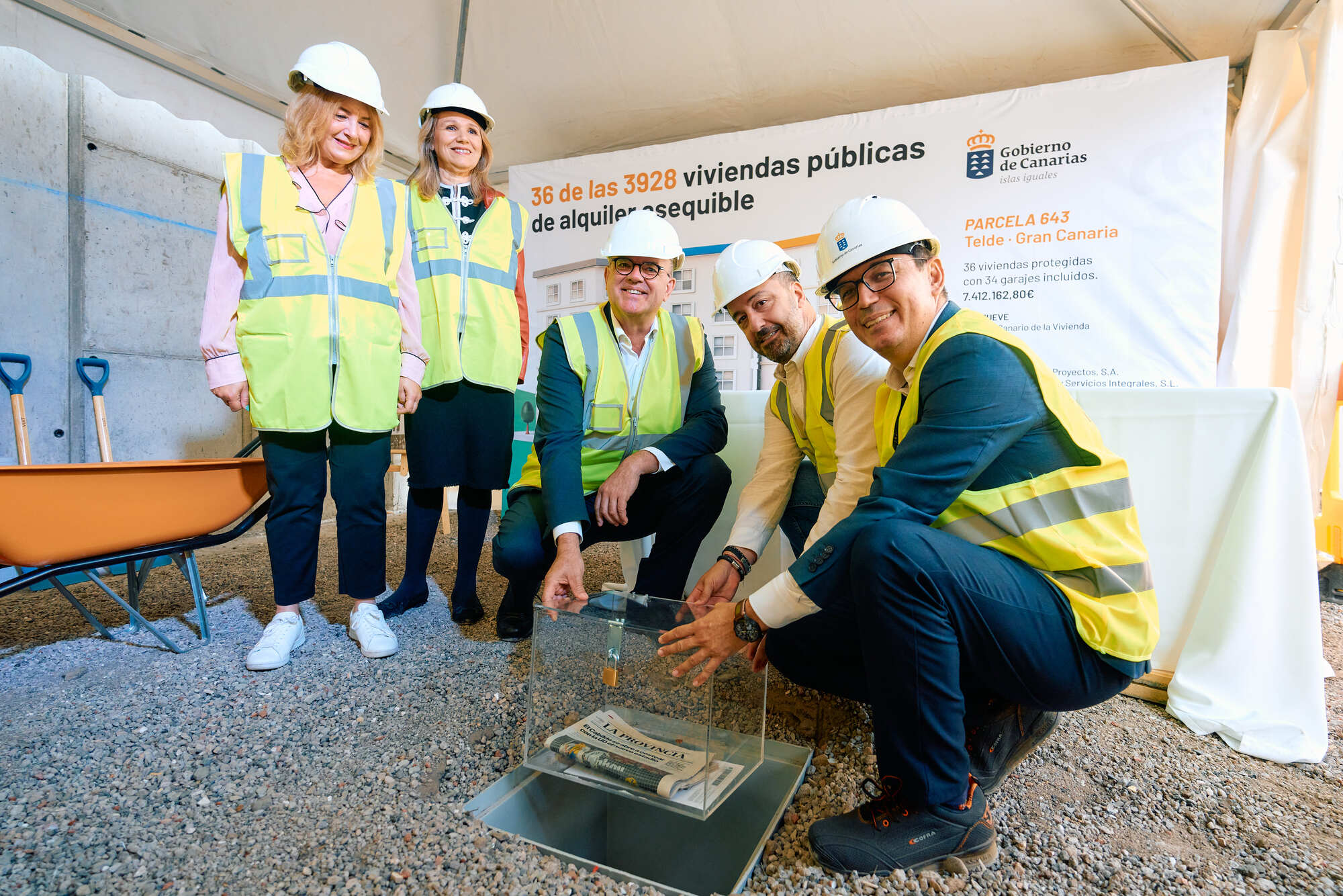 El consejero de Obras Públicas, Vivienda y Movilidad del Gobierno de Canarias, Pablo Rodríguez, junto a la directora del Instituto Canario de la Vivienda (ICAVI), Pino de León, han colocado este martes la primera piedra de un edificio de 36 viviendas protegidas en el barrio de Valle de Jinámar, en el municipio de Telde.