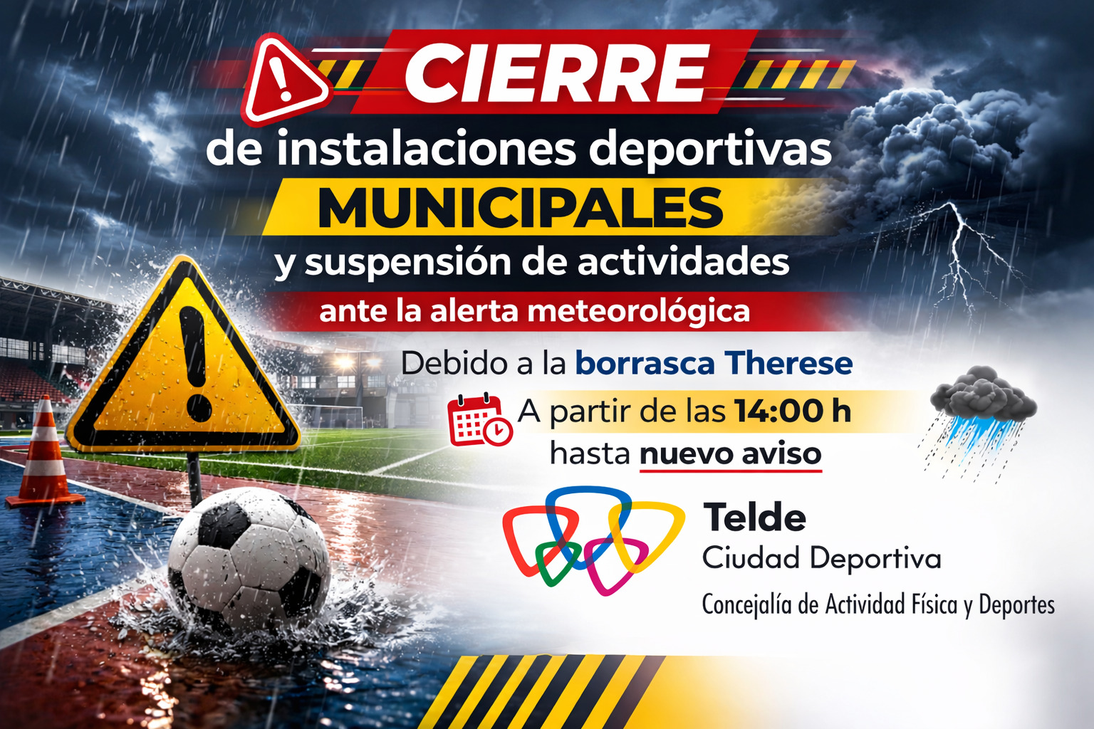 La Concejalía de Actividad Física y Deportes del Ayuntamiento de Telde, dirigida por Cristhian Santana Caballero, informa de que, ante la llegada de la borrasca de alto impacto Therese y tras el decreto de situación de alerta emitido por la Dirección General de Seguridad y Emergencias del Gobierno de Canarias, se adoptan medidas preventivas debido a los fenómenos meteorológicos adversos previstos, que incluyen precipitaciones intensas y fuertes rachas de viento.