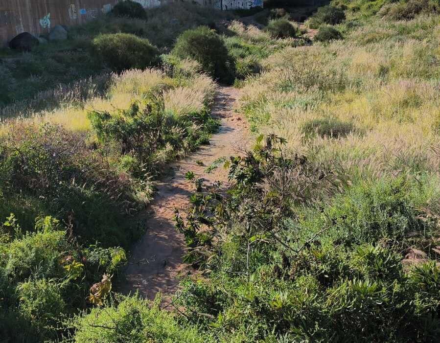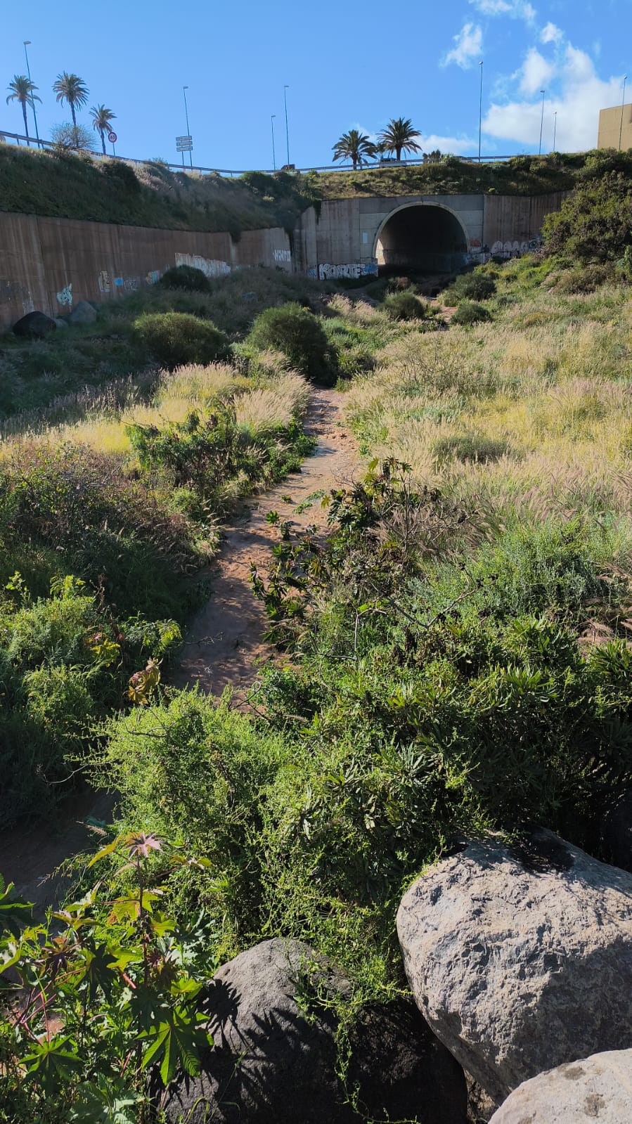El caudal, muy pequeño, se abre paso entre la maleza a la altura de la antigua Máquina del Azúcar, buscando la desembocadura natural hacia el mar.