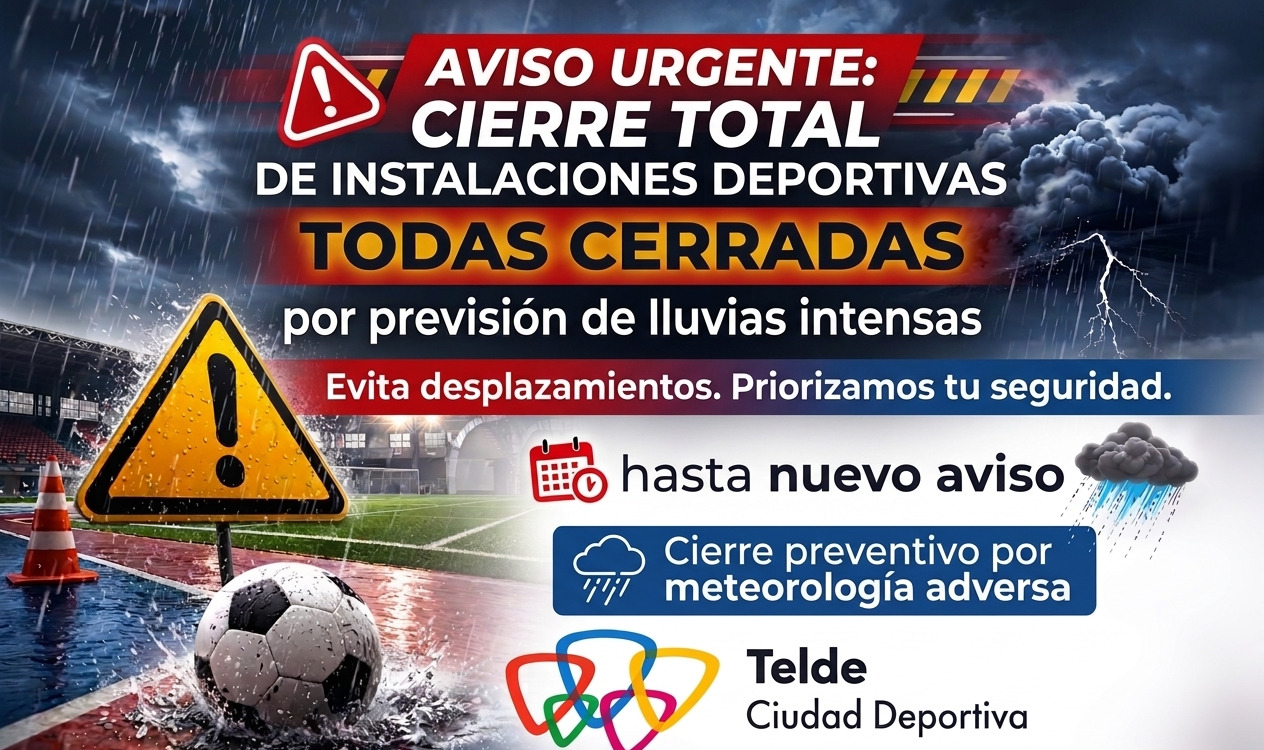 La Concejalía de Actividad Física y Deportes del Ayuntamiento de Telde, dirigida por Cristhian Santana Caballero, informa que ante la previsión de intensas precipitaciones asociadas a la borrasca Therese, se mantiene el cierre de todas las instalaciones deportivas municipales, así como la suspensión de las actividades programadas, como medida preventiva y hasta nuevo aviso.