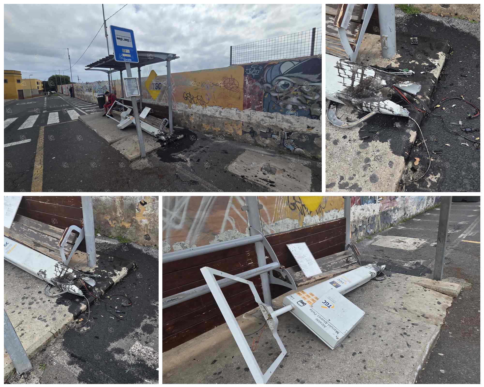 El mobiliario urbano resultó seriamente dañado, con la estructura metálica desplazada y elementos de señalización arrancados, lo que obligará a su reposición por parte de los servicios de mantenimiento de las paradas de guaguas, competencia del Cabildo grancanario.