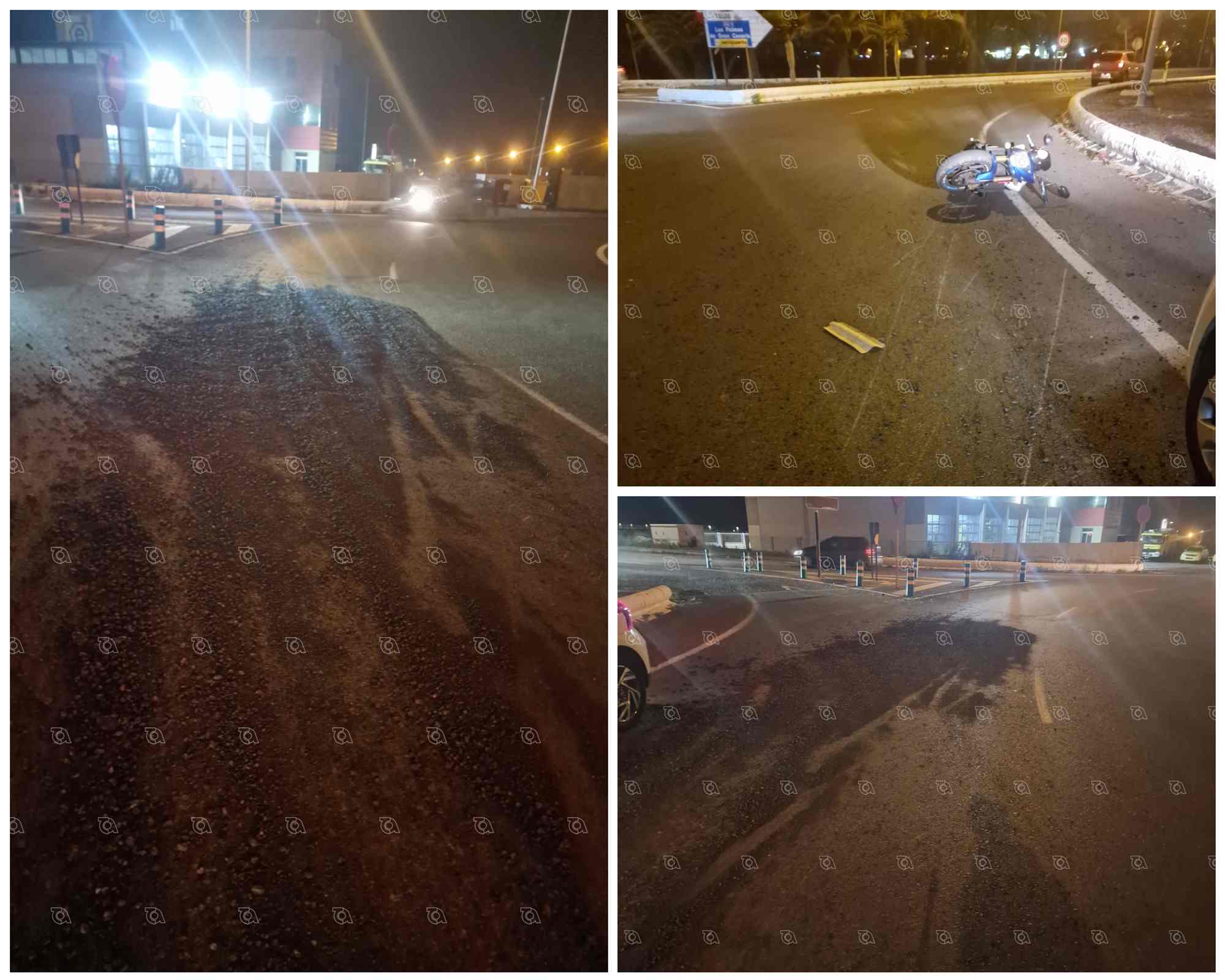 Las imágenes facilitadas muestran una amplia franja de grava dispersa sobre el firme en el acceso y el interior de la rotonda, especialmente en la trayectoria de giro hacia la zona costera. En una de las fotografías se aprecia la motocicleta caída sobre el asfalto, con restos de material extendidos por la vía y marcas visibles de arrastre.